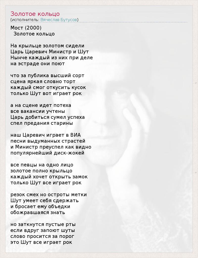 Мост (2000) Золотое кольцо На крыльце золотом сидели Царь Царевич Министр и Шут Нынче каждый из них при деле на эстраде они поют что за публика высший сорт сцена яркая словно торт каждый смог откусить кусок только Шут вот играет рок а на сцене идет потеха все вакансии учтены Царь добиться сумел успеха спел предания старины наш Царевич играет в ВИА песни выдуманных страстей и Министр преуспел как видно популярнейший диск-жокей все певцы на одно лицо золотое полно крыльцо каждый хочет открыть замок только Шут все играет рок резок смех но остроты метки Шут умеет себя сдержать и бросает ему объедки обожравшаяся знать но заткнутся пустые рты если вдруг запоют шуты слово просится за порог это Шут все играет рок