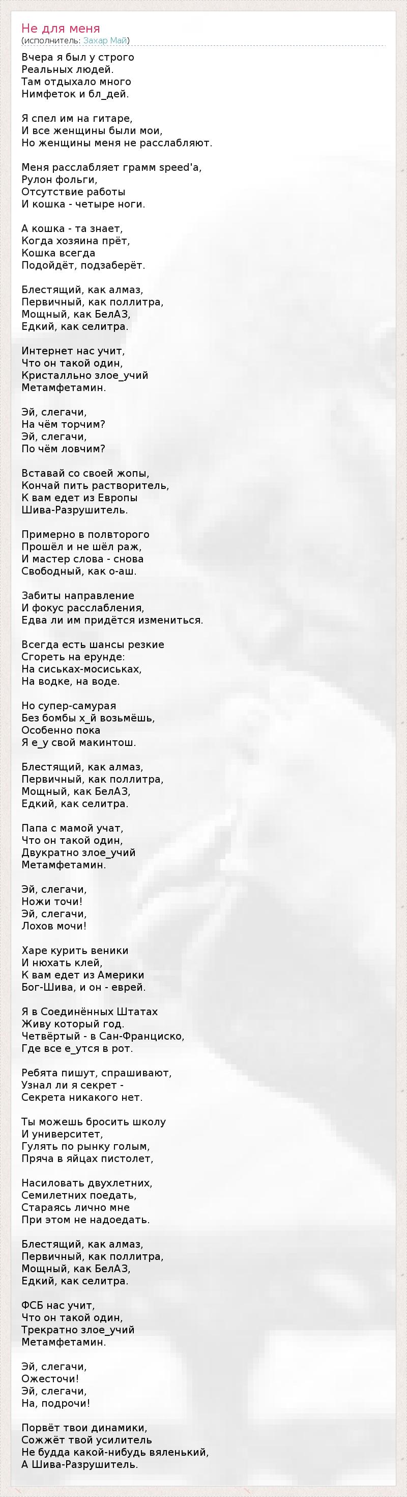 Это интересно:Захар Май легендарно известен мощной игрой на гитаре и красивым пением. Cтиль описать тяжело - оно и реггей, и русское-цыганское, и танцевальное-драйвовое, но - одна гитара, и один голос. Все хвалят. Песни пишет хорошо, но очень мало - поэтому играет не только своё, a и вообще всё, что нравится - и тоже, до смешного качественно.Родился в 1969 г. в г.... продолжение