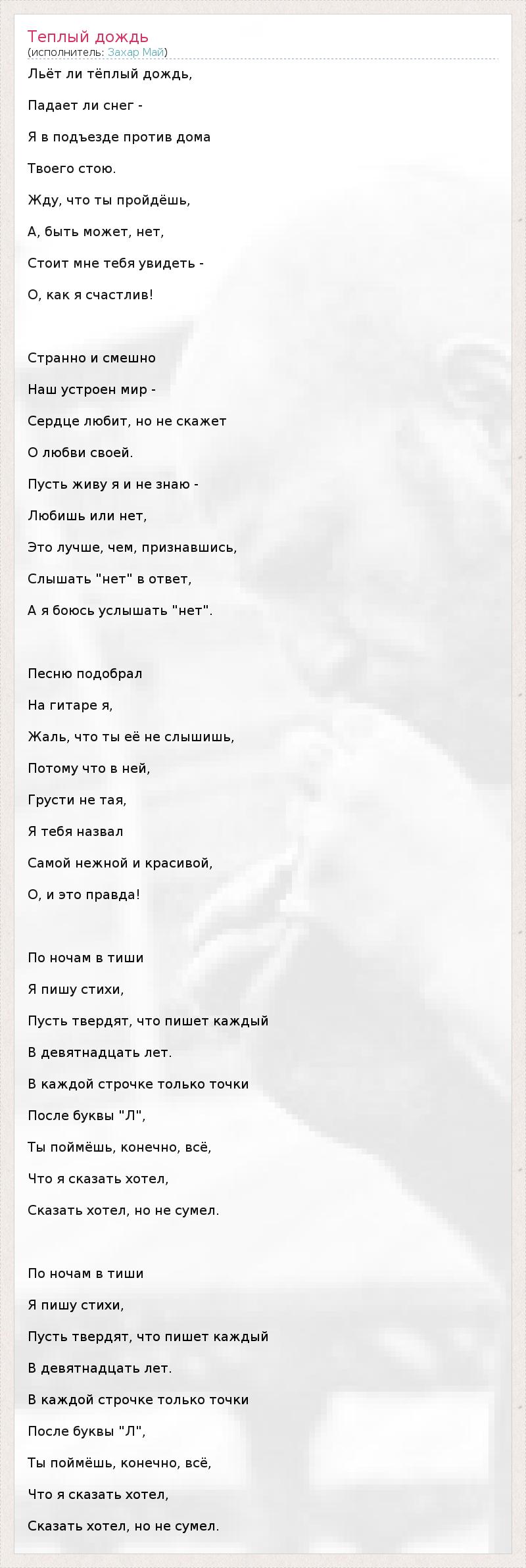 Льёт ли тёплый дождь, Падает ли снег - Я в подъезде против дома Твоего стою. Жду, что ты пройдёшь, А, быть может, нет, Стоит мне тебя увидеть - О, как я счастлив! Странно и смешно Наш устроен мир - Сердце любит, но не скажет О любви своей. Пусть живу я и не знаю - Любишь или нет, Это лучше, чем, признавшись, Слышать "нет" в ответ, А я боюсь услышать "нет". Песню подобрал На гитаре я, Жаль, что ты её не слышишь, Потому что в ней, Грусти не тая, Я тебя назвал Самой нежной и красивой, О, и это правда! По ночам в тиши Я пишу стихи, Пусть твердят, что пишет каждый В девятнадцать лет. В каждой строчке только точки После буквы "Л", Ты поймёшь, конечно, всё, Что я сказать хотел, Сказать хотел, но не сумел. По ночам в тиши Я пишу стихи, Пусть твердят, что пишет каждый В девятнадцать лет. В каждой строчке только точки После буквы "Л", Ты поймёшь, конечно, всё, Что я сказать хотел, Сказать хотел, но не сумел.