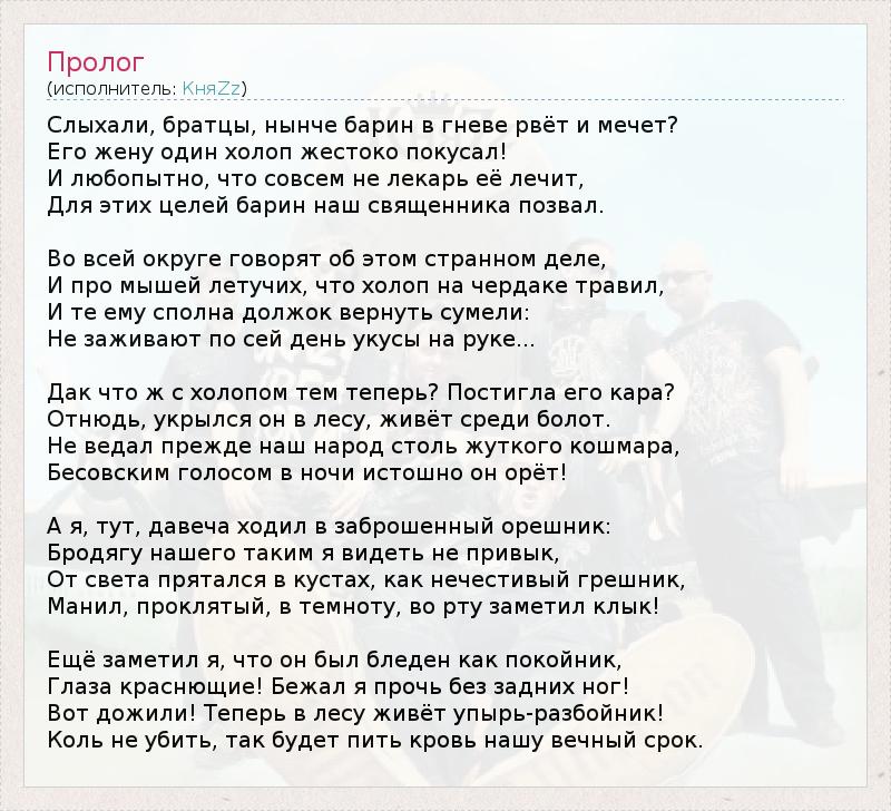 Слыхали, братцы, нынче барин в гневе рвёт и мечет? Его жену один холоп жестоко покусал! И любопытно, что совсем не лекарь её лечит, Для этих целей барин наш священника позвал. Во всей округе говорят об этом странном деле, И про мышей летучих, что холоп на чердаке травил, И те ему сполна должок вернуть сумели: Не заживают по сей день укусы на руке... Дак что ж с холопом тем теперь? Постигла его кара? Отнюдь, укрылся он в лесу, живёт среди болот. Не ведал прежде наш народ столь жуткого кошмара, Бесовским голосом в ночи истошно он орёт! А я, тут, давеча ходил в заброшенный орешник: Бродягу нашего таким я видеть не привык, От света прятался в кустах, как нечестивый грешник, Манил, проклятый, в темноту, во рту заметил клык! Ещё заметил я, что он был бледен как покойник, Глаза краснющие! Бежал я прочь без задних ног! Вот дожили! Теперь в лесу живёт упырь-разбойник! Коль не убить, так будет пить кровь нашу вечный срок.