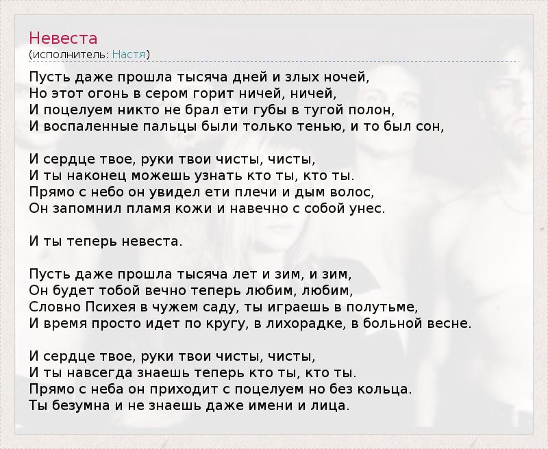 Пусть даже прошла тысяча дней и злых ночей, Но этот огонь в сером горит ничей, ничей, И поцелуем никто не брал ети губы в тугой полон, И воспаленные пальцы были только тенью, и то был сон, И сердце твое, руки твои чисты, чисты, И ты наконец можешь узнать кто ты, кто ты. Прямо с небо он увидел ети плечи и дым волос, Он запомнил пламя кожи и навечно с собой унес. И ты теперь невеста. Пусть даже прошла тысяча лет и зим, и зим, Он будет тобой вечно теперь любим, любим, Словно Психея в чужем саду, ты играешь в полутьме, И время просто идет по кругу, в лихорадке, в больной весне. И сердце твое, руки твои чисты, чисты, И ты навсегда знаешь теперь кто ты, кто ты. Прямо с неба он приходит с поцелуем но без кольца. Ты безумна и не знаешь даже имени и лица.