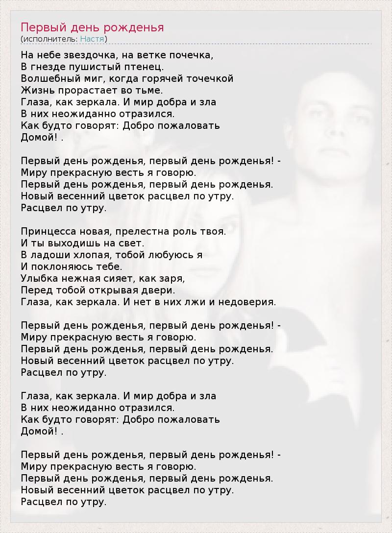 На небе звездочка, на ветке почечка, В гнезде пушистый птенец. Волшебный миг, когда горячей точечкой Жизнь прорастает во тьме. Глаза, как зеркала. И мир добра и зла В них неожиданно отразился. Как будто говорят: Добро пожаловать Домой! . Первый день рожденья, первый день рожденья! - Миру прекрасную весть я говорю. Первый день рожденья, первый день рожденья. Новый весенний цветок расцвел по утру. Расцвел по утру. Принцесса новая, прелестна роль твоя. И ты выходишь на свет. В ладоши хлопая, тобой любуюсь я И поклоняюсь тебе. Улыбка нежная сияет, как заря, Перед тобой открывая двери. Глаза, как зеркала. И нет в них лжи и недоверия. Первый день рожденья, первый день рожденья! - Миру прекрасную весть я говорю. Первый день рожденья, первый день рожденья. Новый весенний цветок расцвел по утру. Расцвел по утру. Глаза, как зеркала. И мир добра и зла В них неожиданно отразился. Как будто говорят: Добро пожаловать Домой! . Первый день рожденья, первый день рожденья! - Миру прекрасную весть я говорю. Первый день рожденья, первый день рожденья. Новый весенний цветок расцвел по утру. Расцвел по утру.