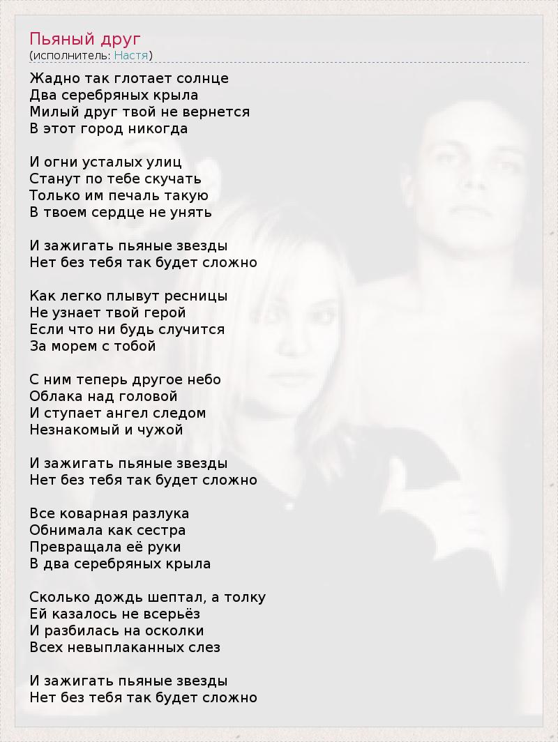 Жадно так глотает солнце Два серебряных крыла Милый друг твой не вернется В этот город никогда И огни усталых улиц Станут по тебе скучать Только им печаль такую В твоем сердце не унять И зажигать пьяные звезды Нет без тебя так будет сложно Как легко плывут ресницы Не узнает твой герой Если что ни будь случится За морем с тобой С ним теперь другое небо Облака над головой И ступает ангел следом Незнакомый и чужой И зажигать пьяные звезды Нет без тебя так будет сложно Все коварная разлука Обнимала как сестра Превращала её руки В два серебряных крыла Сколько дождь шептал, а толку Ей казалось не всерьёз И разбилась на осколки Всех невыплаканных слез И зажигать пьяные звезды Нет без тебя так будет сложно