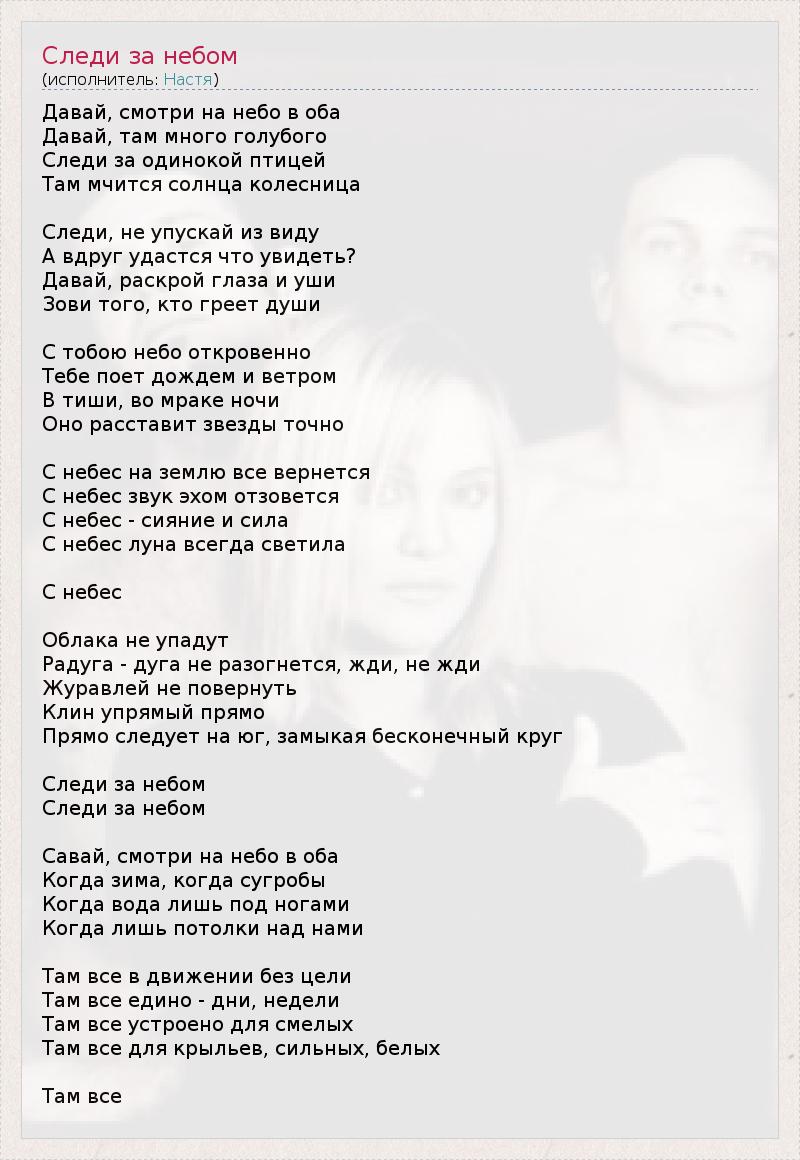 Давай, смотри на небо в оба Давай, там много голубого Следи за одинокой птицей Там мчится солнца колесница Следи, не упускай из виду А вдруг удастся что увидеть? Давай, раскрой глаза и уши Зови того, кто греет души С тобою небо откровенно Тебе поет дождем и ветром В тиши, во мраке ночи Оно расставит звезды точно С небес на землю все вернется С небес звук эхом отзовется С небес - сияние и сила С небес луна всегда светила С небес Облака не упадут Радуга - дуга не разогнется, жди, не жди Журавлей не повернуть Клин упрямый прямо Прямо следует на юг, замыкая бесконечный круг Следи за небом Следи за небом Савай, смотри на небо в оба Когда зима, когда сугробы Когда вода лишь под ногами Когда лишь потолки над нами Там все в движении без цели Там все едино - дни, недели Там все устроено для смелых Там все для крыльев, сильных, белых Там все