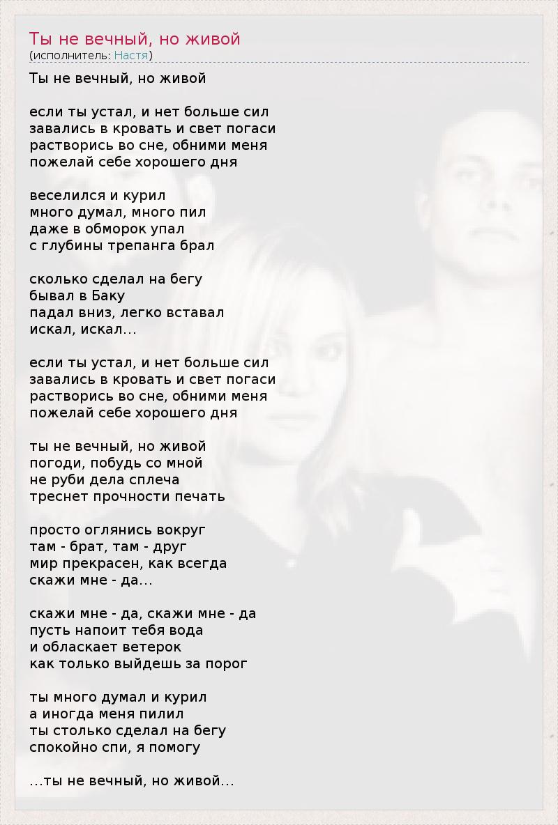 Ты не вечный, но живой если ты устал, и нет больше сил завались в кровать и свет погаси растворись во сне, обними меня пожелай себе хорошего дня веселился и курил много думал, много пил даже в обморок упал с глубины трепанга брал сколько сделал на бегу бывал в Баку падал вниз, легко вставал искал, искал… если ты устал, и нет больше сил завались в кровать и свет погаси растворись во сне, обними меня пожелай себе хорошего дня ты не вечный, но живой погоди, побудь со мной не руби дела сплеча треснет прочности печать просто оглянись вокруг там - брат, там - друг мир прекрасен, как всегда скажи мне - да… скажи мне - да, скажи мне - да пусть напоит тебя вода и обласкает ветерок как только выйдешь за порог ты много думал и курил а иногда меня пилил ты столько сделал на бегу спокойно спи, я помогу …ты не вечный, но живой…