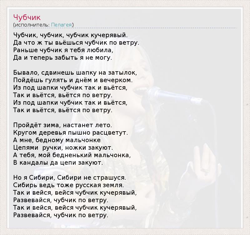 Чубчик, чубчик, чубчик кучерявый. Да что ж ты вьёшься чубчик по ветру. Раньше чубчик я тебя любила, Да и теперь забыть я не могу. Бывало, сдвинешь шапку на затылок, Пойдёшь гулять и днём и вечерком. Из под шапки чубчик так и вьётся, Так и вьётся, вьётся по ветру. Из под шапки чубчик так и вьётся, Так и вьётся, вьётся по ветру. Пройдёт зима, настанет лето. Кругом деревья пышно расцветут. А мне, бедному мальчонке Цепями ручки, ножки закуют. А тебя, мой бедненький мальчонка, В кандалы да цепи закуют. Но я Сибири, Сибири не страшуся. Сибирь ведь тоже русская земля. Так и вейся, вейся чубчик кучерявый, Развевайся, чубчик по ветру. Так и вейся, вейся чубчик кучерявый, Развевайся, чубчик по ветру.