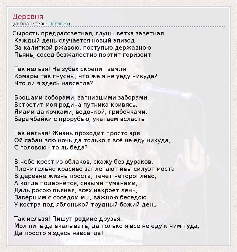 Сырость предрассветная, глушь ветха заветная Каждый день случается новый эпизод За калиткой ржавою, поступью державною Пьянь, сосед безжалостно портит горизонт Так нельзя! На зубах скрепит земля Комары так гнусны, что же я не уеду никуда? Что ли я здесь навсегда? Брошами соборами, загнившими заборами, Встретит моя родина путника кривясь. Ямами да кочками, водочкой, грибочками, Барамбайки с прорубью, укатаем всласть Так нельзя! Жизнь проходит просто зря Ой сабан всю ночь да только я всё не еду никуда, С головою что ль беда? В небе крест из облаков, скажу без дураков, Пленительно красиво заплетают ивы силуэт моста В деревне жизнь проста, течет неторопливо, А когда подернется, сизыми туманами, Даль росою пьяная, всех накроет лень, Завершим с соседом мы, важною беседою У костра под яблонькой трудный божий день Так нельзя! Пишут родине друзья. Мол пить да вкалывать, да только я все не еду к ним туда, Да просто я здесь навсегда!