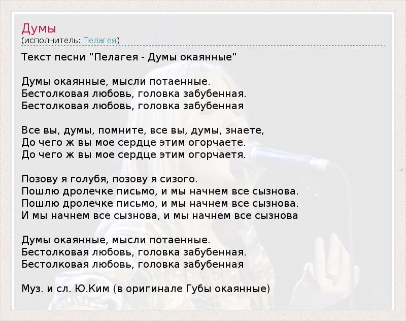Текст песни "Пелагея - Думы окаянные" Думы окаянные, мысли потаенные. Бестолковая любовь, головка забубенная. Бестолковая любовь, головка забубенная Все вы, думы, помните, все вы, думы, знаете, До чего ж вы мое сердце этим огорчаете. До чего ж вы мое сердце этим огорчаетя. Позову я голубя, позову я сизого. Пошлю дролечке письмо, и мы начнем все сызнова. Пошлю дролечке письмо, и мы начнем все сызнова. И мы начнем все сызнова, и мы начнем все сызнова Думы окаянные, мысли потаенные. Бестолковая любовь, головка забубенная. Бестолковая любовь, головка забубенная Муз. и сл. Ю.Ким (в оригинале Губы окаянные)
