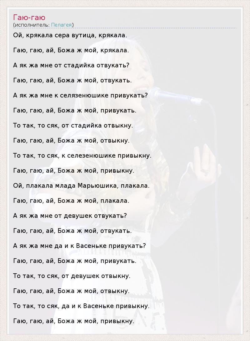 Ой, крякала сера вутица, крякала. Гаю, гаю, ай, Божа ж мой, крякала. А як жа мне от стадийка отвукать? Гаю, гаю, ай, Божа ж мой, отвукать. А як жа мне к селязенюшике привукать? Гаю, гаю, ай, Божа ж мой, привукать. То так, то сяк, от стадийка отвыкну. Гаю, гаю, ай, Божа ж мой, отвыкну. То так, то сяк, к селезенюшике привыкну. Гаю, гаю, ай, Божа ж мой, привыкну. Ой, плакала млада Марьюшика, плакала. Гаю, гаю, ай, Божа ж мой, плакала. А як жа мне от девушек отвукать? Гаю, гаю, ай, Божа ж мой, отвукать. А як жа мне да и к Васеньке привукать? Гаю, гаю, ай, Божа ж мой, привукать. То так, то сяк, от девушек отвыкну. Гаю, гаю, ай, Божа ж мой, отвыкну. То так, то сяк, да и к Васеньке привыкну. Гаю, гаю, ай, Божа ж мой, привыкну.