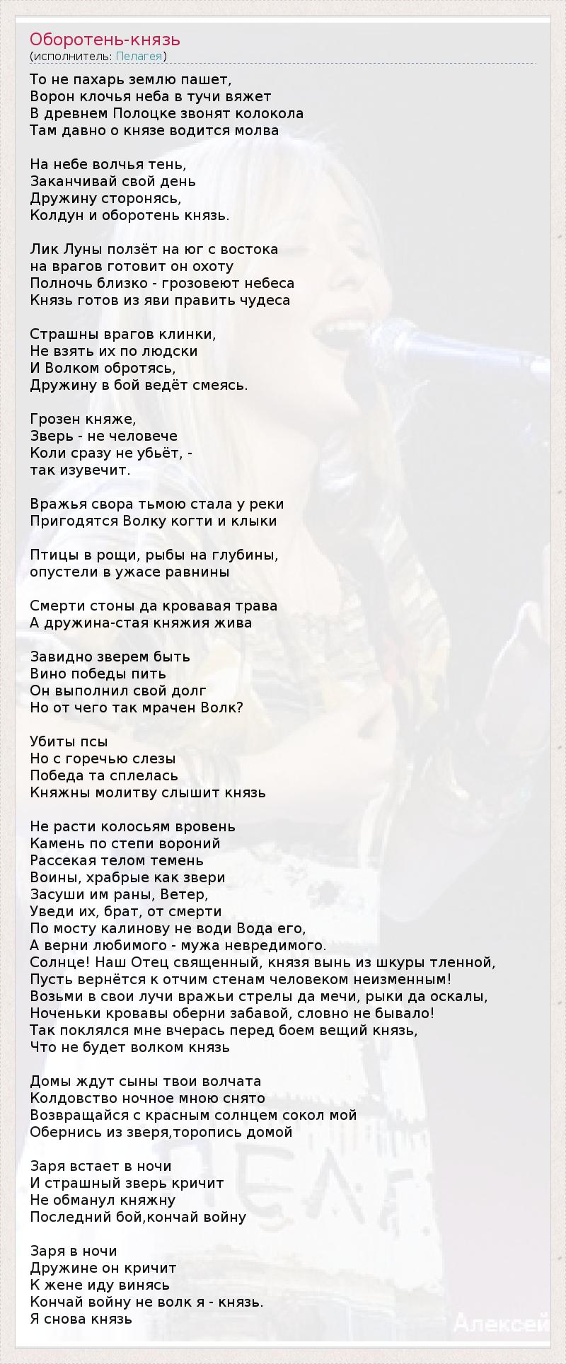 То не пахарь землю пашет, Ворон клочья неба в тучи вяжет В древнем Полоцке звонят колокола Там давно о князе водится молва На небе волчья тень, Заканчивай свой день Дружину сторонясь, Колдун и оборотень князь. Лик Луны ползёт на юг с востока на врагов готовит он охоту Полночь близко - грозовеют небеса Князь готов из яви править чудеса Страшны врагов клинки, Не взять их по людски И Волком обротясь, Дружину в бой ведёт смеясь. Грозен княже, Зверь - не человече Коли сразу не убьёт, - так изувечит. Вражья свора тьмою стала у реки Пригодятся Волку когти и клыки Птицы в рощи, рыбы на глубины, опустели в ужасе равнины Смерти стоны да кровавая трава А дружина-стая княжия жива Завидно зверем быть Вино победы пить Он выполнил свой долг Но от чего так мрачен Волк? Убиты псы Но с горечью слезы Победа та сплелась Княжны молитву слышит князь Не расти колосьям вровень Камень по степи вороний Рассекая телом темень Воины, храбрые как звери Засуши им раны, Ветер, Уведи их, брат, от смерти По мосту калинову не води Вода его, А верни любимого - мужа невредимого. Солнце! Наш Отец священный, князя вынь из шкуры тленной, Пусть вернётся к отчим стенам человеком неизменным! Возьми в свои лучи вражьи стрелы да мечи, рыки да оскалы, Ноченьки кровавы оберни забавой, словно не бывало! Так поклялся мне вчерась перед боем вещий князь, Что не будет волком князь Домы ждут сыны твои волчата Колдовство ночное мною снято Возвращайся с красным солнцем сокол мой Обернись из зверя,торопись домой Заря встает в ночи И страшный зверь кричит Не обманул княжну Последний бой,кончай войну Заря в ночи Дружине он кричит К жене иду винясь Кончай войну не волк я - князь. Я снова князь