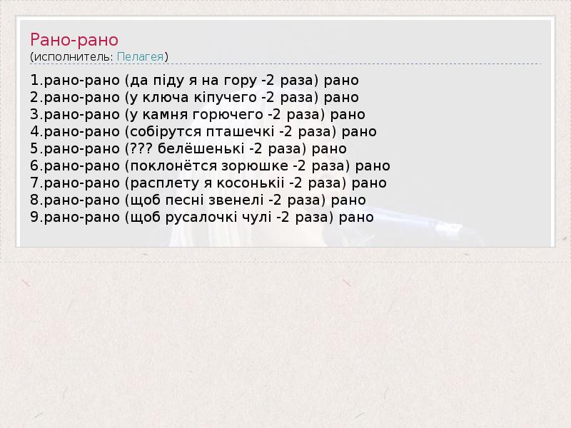 1.рано-рано (да піду я на гору -2 раза) рано 2.рано-рано (у ключа кіпучего -2 раза) рано 3.рано-рано (у камня горючего -2 раза) рано 4.рано-рано (собірутся пташечкі -2 раза) рано 5.рано-рано (??? белёшенькі -2 раза) рано 6.рано-рано (поклонётся зорюшке -2 раза) рано 7.рано-рано (расплету я косонькіі -2 раза) рано 8.рано-рано (щоб песні звенелі -2 раза) рано 9.рано-рано (щоб русалочкі чулі -2 раза) рано