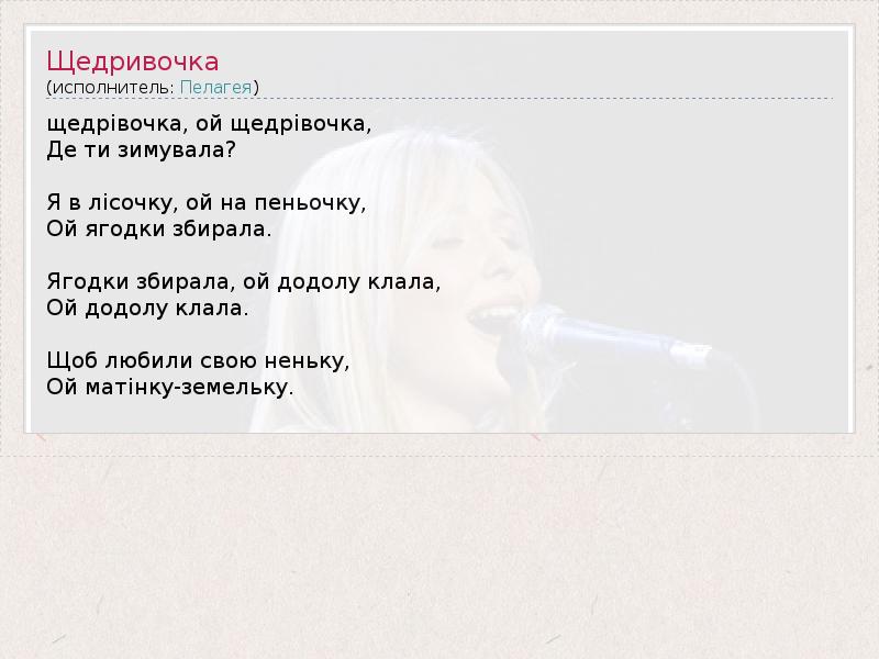 щедрівочка, ой щедрівочка, Де ти зимувала? Я в лісочку, ой на пеньочку, Ой ягодки збирала. Ягодки збирала, ой додолу клала, Ой додолу клала. Щоб любили свою неньку, Ой матінку-земельку.