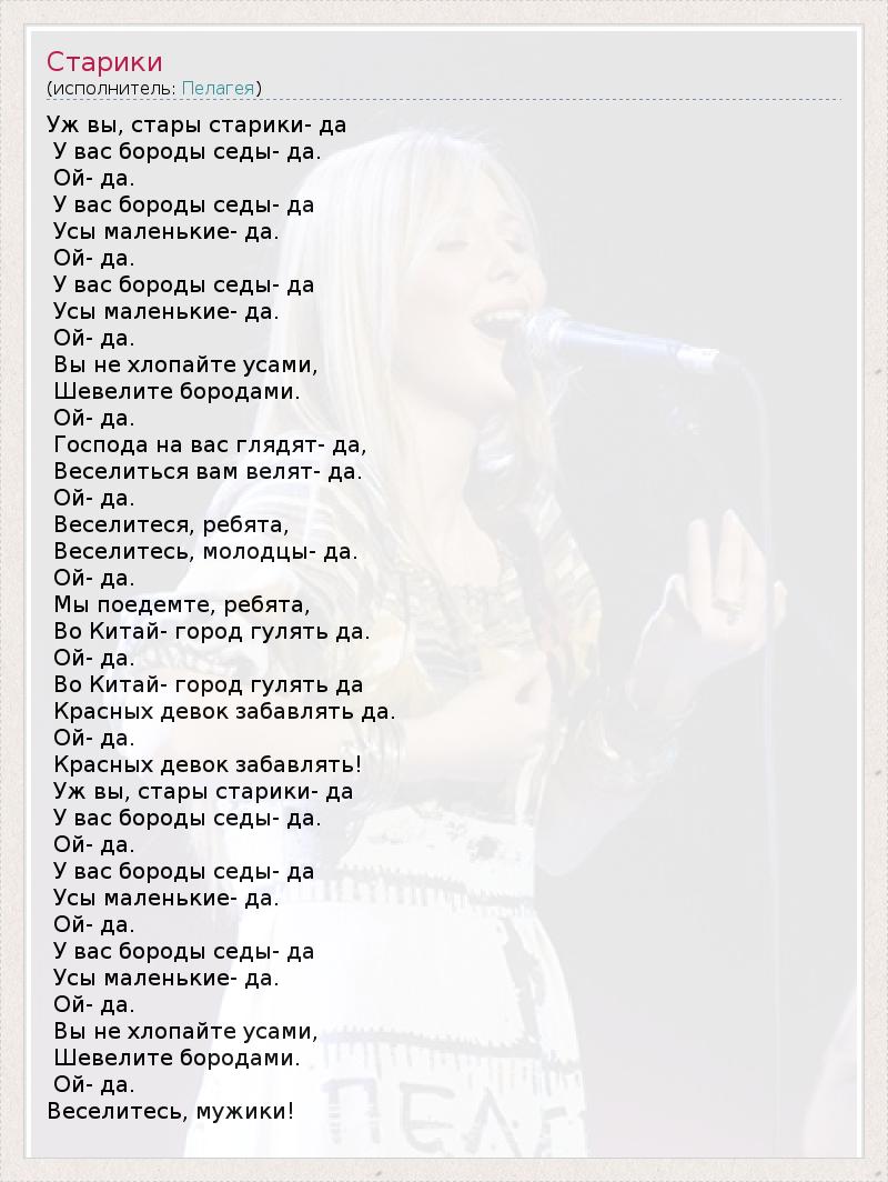 Уж вы, стары старики- да У вас бороды седы- да. Ой- да. У вас бороды седы- да Усы маленькие- да. Ой- да. У вас бороды седы- да Усы маленькие- да. Ой- да. Вы не хлопайте усами, Шевелите бородами. Ой- да. Господа на вас глядят- да, Веселиться вам велят- да. Ой- да. Веселитеся, ребята, Веселитесь, молодцы- да. Ой- да. Мы поедемте, ребята, Во Китай- город гулять да. Ой- да. Во Китай- город гулять да Красных девок забавлять да. Ой- да. Красных девок забавлять! Уж вы, стары старики- да У вас бороды седы- да. Ой- да. У вас бороды седы- да Усы маленькие- да. Ой- да. У вас бороды седы- да Усы маленькие- да. Ой- да. Вы не хлопайте усами, Шевелите бородами. Ой- да. Веселитесь, мужики!