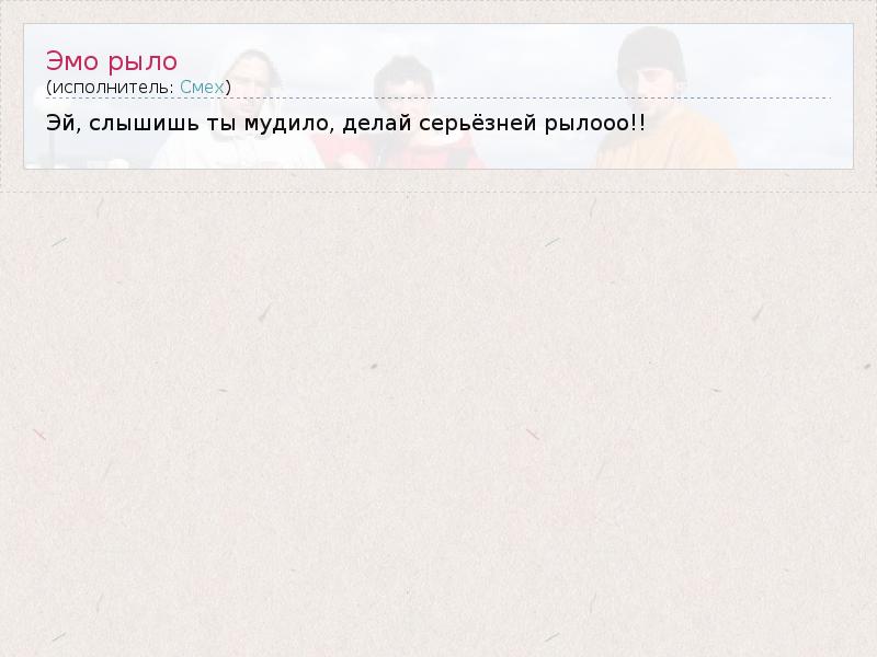 Это интересно:Группа СМЕХ была образована в 1999 году в г. Истра (Московской области) двумя братьями: Максимом (Грузин) и Сергеем (Чуп). Свой стиль СМЕХ называют «Калифорнистринский панк-рок», шутливо намекая на свой родной город, а также на своих кумиров из солнечной Калифорнии – NOFX и RANCID. Долгое время парни не могли найти себе подходящего барабанщика. Подходящего, не только по музыкальным качествам... продолжение