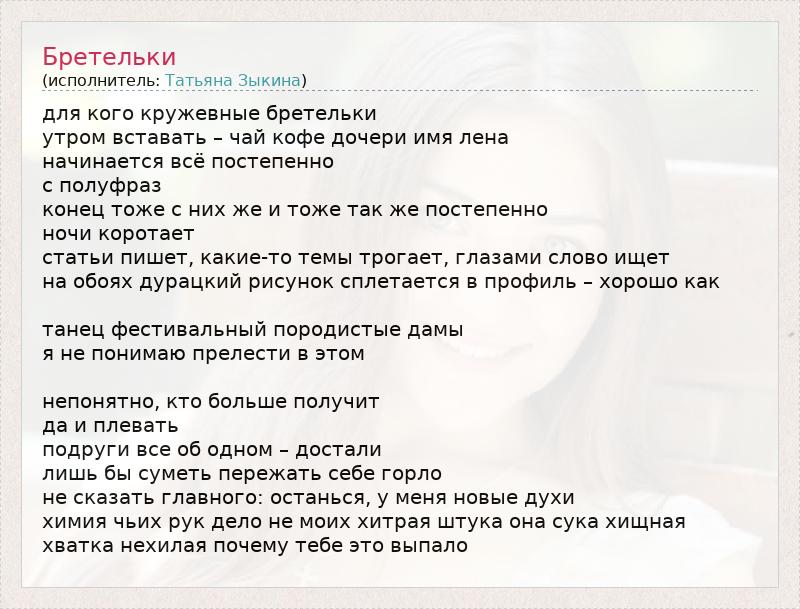 Это интересно:Татьяна Зыкина родилась в Ижевске 20 апреля 1981 году. Работала журналистом, теле- и радио-ведущей. Песни начала сочинять в... продолжение