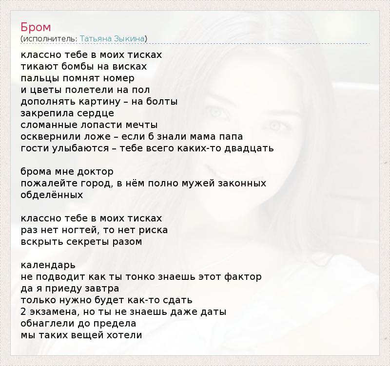 классно тебе в моих тисках тикают бомбы на висках пальцы помнят номер и цветы полетели на пол дополнять картину – на болты закрепила сердце сломанные лопасти мечты осквернили ложе – если б знали мама папа гости улыбаются – тебе всего каких-то двадцать брома мне доктор пожалейте город, в нём полно мужей законных обделённых классно тебе в моих тисках раз нет ногтей, то нет риска вскрыть секреты разом календарь не подводит как ты тонко знаешь этот фактор да я приеду завтра только нужно будет как-то сдать 2 экзамена, но ты не знаешь даже даты обнаглели до предела мы таких вещей хотели