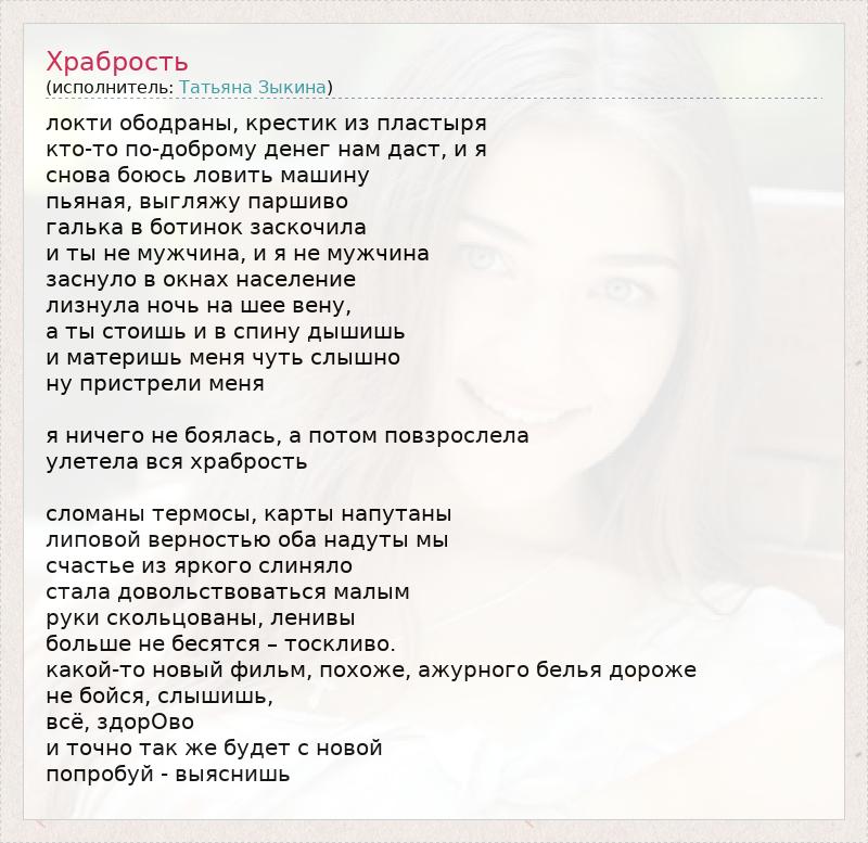 Это интересно:Татьяна Зыкина родилась в Ижевске 20 апреля 1981 году. Работала журналистом, теле- и радио-ведущей. Песни начала сочинять в... продолжение