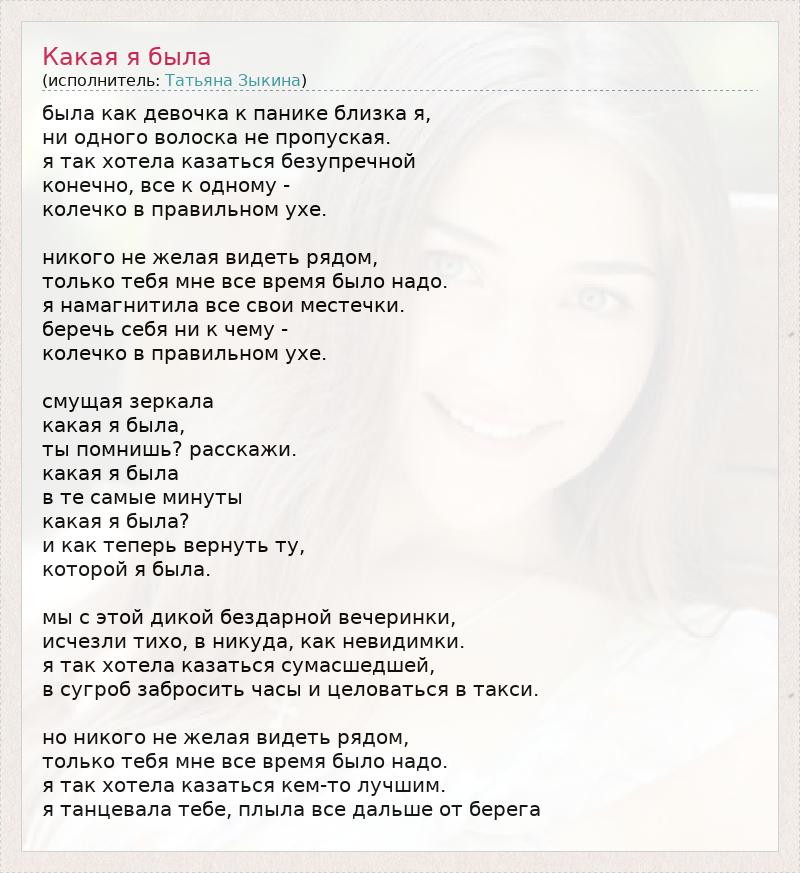 Это интересно:Татьяна Зыкина родилась в Ижевске 20 апреля 1981 году. Работала журналистом, теле- и радио-ведущей. Песни начала сочинять в... продолжение
