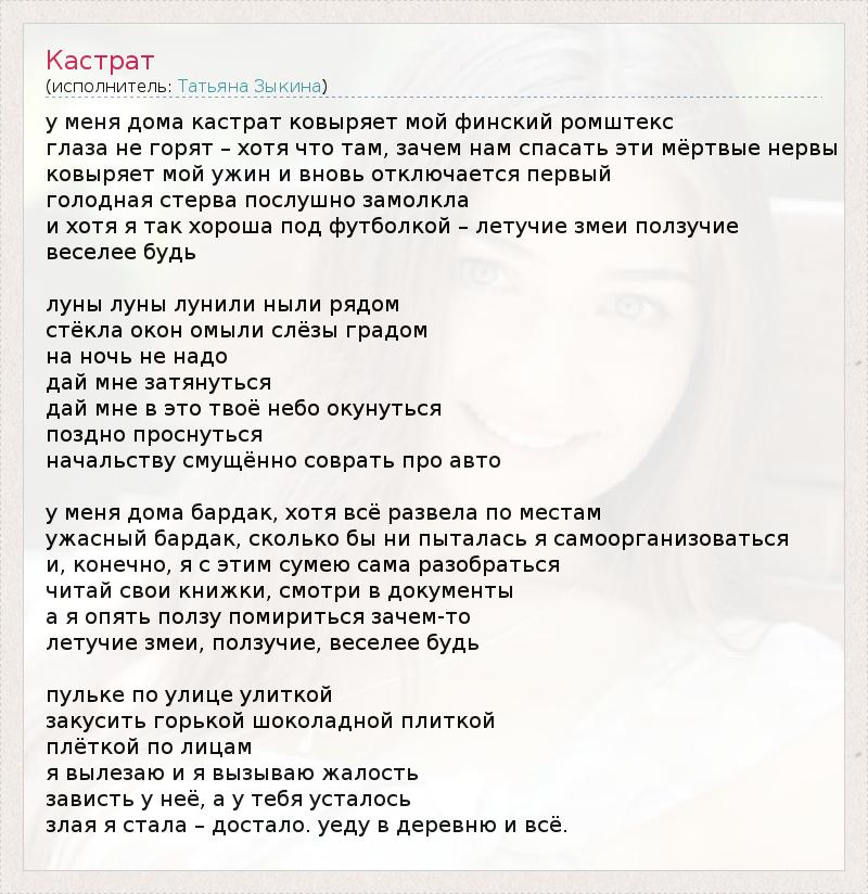 у меня дома кастрат ковыряет мой финский ромштекс глаза не горят – хотя что там, зачем нам спасать эти мёртвые нервы ковыряет мой ужин и вновь отключается первый голодная стерва послушно замолкла и хотя я так хороша под футболкой – летучие змеи ползучие веселее будь луны луны лунили ныли рядом стёкла окон омыли слёзы градом на ночь не надо дай мне затянуться дай мне в это твоё небо окунуться поздно проснуться начальству смущённо соврать про авто у меня дома бардак, хотя всё развела по местам ужасный бардак, сколько бы ни пыталась я самоорганизоваться и, конечно, я с этим сумею сама разобраться читай свои книжки, смотри в документы а я опять ползу помириться зачем-то летучие змеи, ползучие, веселее будь пульке по улице улиткой закусить горькой шоколадной плиткой плёткой по лицам я вылезаю и я вызываю жалость зависть у неё, а у тебя усталось злая я стала – достало. уеду в деревню и всё.