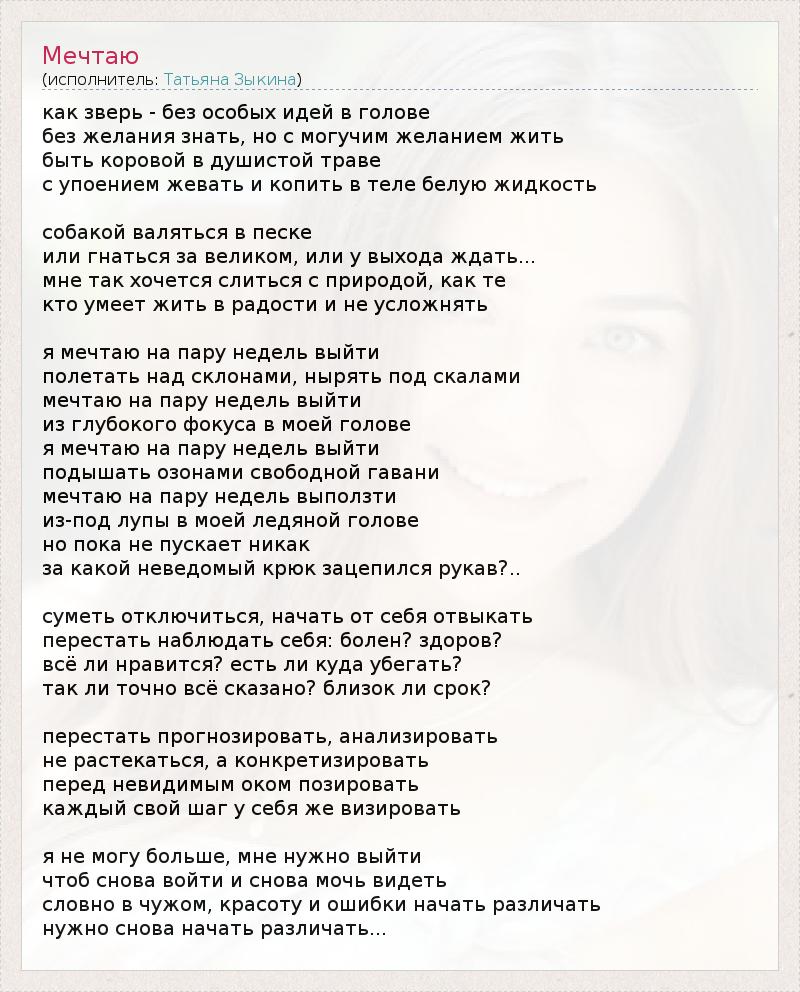 как зверь - без особых идей в голове без желания знать, но с могучим желанием жить быть коровой в душистой траве с упоением жевать и копить в теле белую жидкость собакой валяться в песке или гнаться за великом, или у выхода ждать... мне так хочется слиться с природой, как те кто умеет жить в радости и не усложнять я мечтаю на пару недель выйти полетать над склонами, нырять под скалами мечтаю на пару недель выйти из глубокого фокуса в моей голове я мечтаю на пару недель выйти подышать озонами свободной гавани мечтаю на пару недель выползти из-под лупы в моей ледяной голове но пока не пускает никак за какой неведомый крюк зацепился рукав?.. суметь отключиться, начать от себя отвыкать перестать наблюдать себя: болен? здоров? всё ли нравится? есть ли куда убегать? так ли точно всё сказано? близок ли срок? перестать прогнозировать, анализировать не растекаться, а конкретизировать перед невидимым оком позировать каждый свой шаг у себя же визировать я не могу больше, мне нужно выйти чтоб снова войти и снова мочь видеть словно в чужом, красоту и ошибки начать различать нужно снова начать различать...