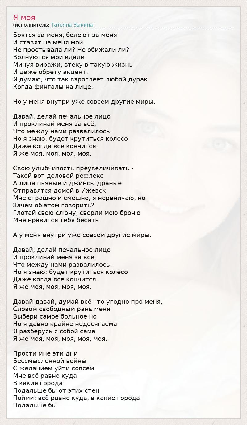 Боятся за меня, болеют за меня И ставят на меня мои. Не простывала ли? Не обижали ли? Волнуются мои вдали. Минуя виражи, втеку в такую жизнь И даже обрету акцент. Я думаю, что так взрослеет любой дурак Когда фингалы на лице. Но у меня внутри уже совсем другие миры. Давай, делай печальное лицо И проклинай меня за всё, Что между нами развалилось. Но я знаю: будет крутиться колесо Даже когда всё кончится. Я же моя, моя, моя, моя. Свою улыбчивость преувеличивать - Такой вот деловой рефлекс А лица пьяные и джинсы драные Отправятся домой в Ижевск Мне страшно и смешно, я нервничаю, но Зачем об этом говорить? Глотай свою слюну, сверли мою броню Мне нравится тебя бесить. А у меня внутри уже совсем другие миры. Давай, делай печальное лицо И проклинай меня за всё, Что между нами развалилось. Но я знаю: будет крутиться колесо Даже когда всё кончится. Я же моя, моя, моя, моя. Давай-давай, думай всё что угодно про меня, Словом свободным рань меня Выбери самое больное но Но я давно крайне недосягаема Я разберусь с собой сама Я же моя, моя, моя, моя, моя. Прости мне эти дни Бессмысленной войны С желанием уйти совсем Мне всё равно куда В какие города Подальше бы от этих стен Пойми: всё равно куда, в какие города Подальше бы.