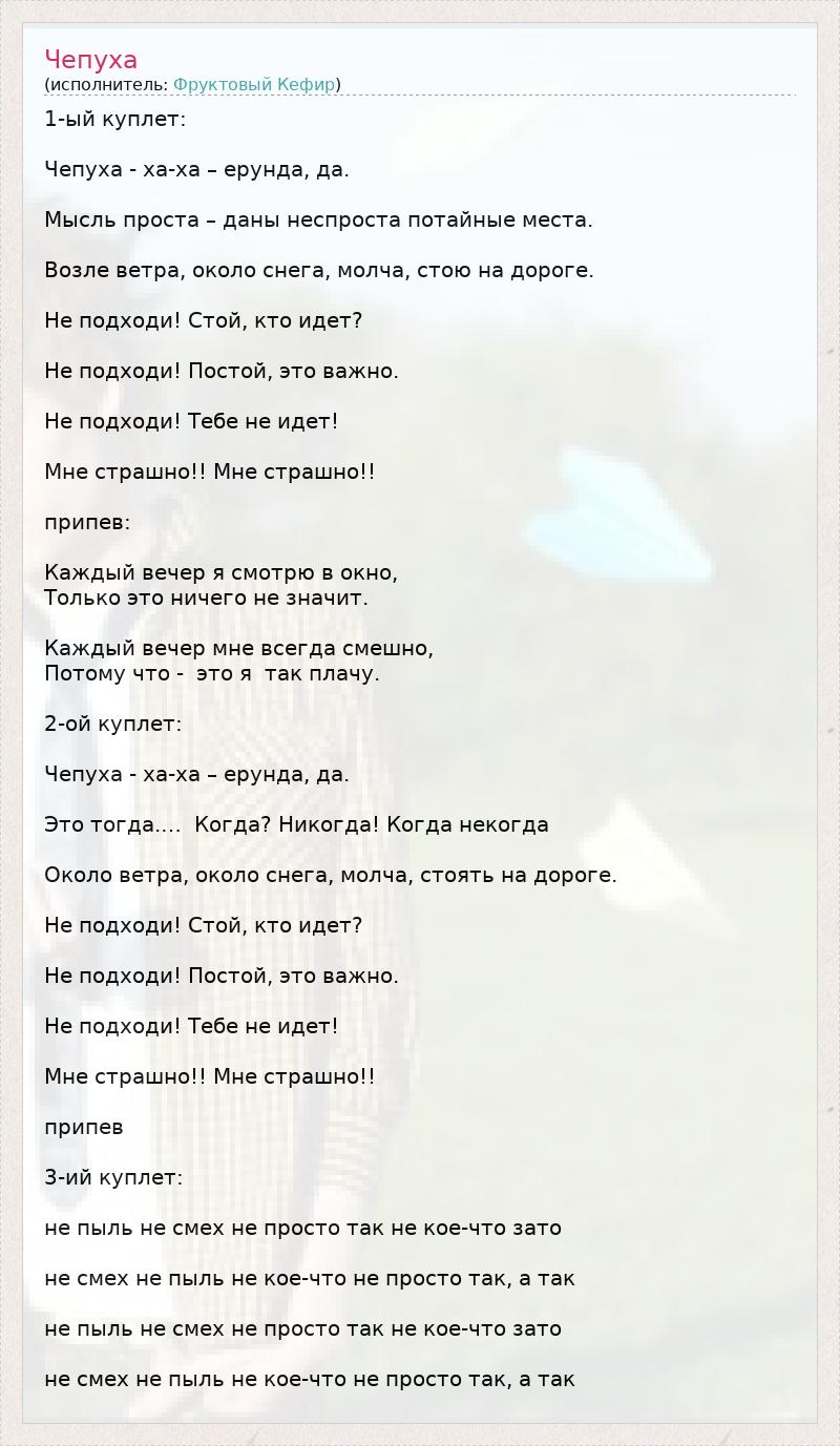 1-ый куплет: Чепуха - ха-ха – ерунда, да. Мысль проста – даны неспроста потайные места. Возле ветра, около снега, молча, стою на дороге. Не подходи! Стой, кто идет? Не подходи! Постой, это важно. Не подходи! Тебе не идет! Мне страшно!! Мне страшно!! припев: Каждый вечер я смотрю в окно, Только это ничего не значит. Каждый вечер мне всегда смешно, Потому что - это я так плачу. 2-ой куплет: Чепуха - ха-ха – ерунда, да. Это тогда.… Когда? Никогда! Когда некогда Около ветра, около снега, молча, стоять на дороге. Не подходи! Стой, кто идет? Не подходи! Постой, это важно. Не подходи! Тебе не идет! Мне страшно!! Мне страшно!! припев 3-ий куплет: не пыль не смех не просто так не кое-что зато не смех не пыль не кое-что не просто так, а так не пыль не смех не просто так не кое-что зато не смех не пыль не кое-что не просто так, а так