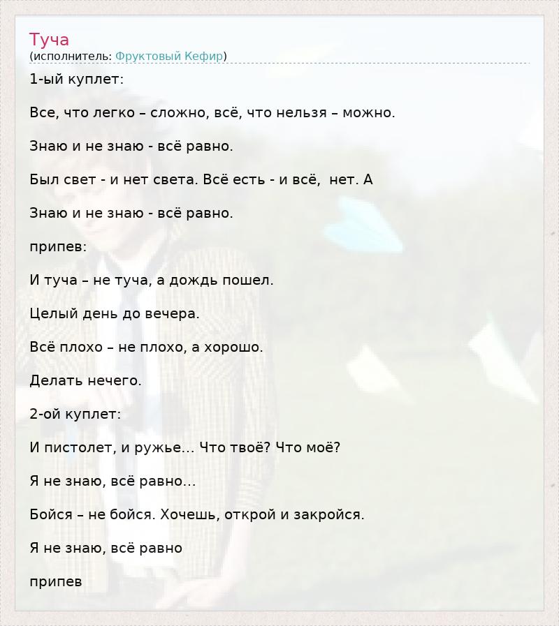 1-ый куплет: Все, что легко – сложно, всё, что нельзя – можно. Знаю и не знаю - всё равно. Был свет - и нет света. Всё есть - и всё, нет. А Знаю и не знаю - всё равно. припев: И туча – не туча, а дождь пошел. Целый день до вечера. Всё плохо – не плохо, а хорошо. Делать нечего. 2-ой куплет: И пистолет, и ружье… Что твоё? Что моё? Я не знаю, всё равно… Бойся – не бойся. Хочешь, открой и закройся. Я не знаю, всё равно припев