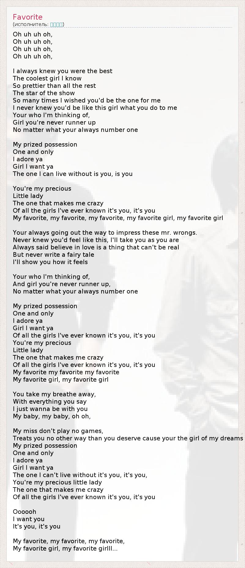 Oh uh uh oh, Oh uh uh oh, Oh uh uh oh, Oh uh uh oh, I always knew you were the best The coolest girl I know So prettier than all the rest The star of the show So many times I wished you'd be the one for me I never knew you'd be like this girl what you do to me Your who I'm thinking of, Girl you're never runner up No matter what your always number one My prized possession One and only I adore ya Girl I want ya The one I can live without is you, is you You're my precious Little lady The one that makes me crazy Of all the girls I've ever known it's you, it's you My favorite, my favorite, my favorite, my favorite girl, my favorite girl Your always going out the way to impress these mr. wrongs. Never knew you'd feel like this, I'll take you as you are Always said believe in love is a thing that can't be real But never write a fairy tale I'll show you how it feels Your who I'm thinking of, And girl you're never runner up, No matter what your always number one My prized possession One and only I adore ya Girl I want ya Of all the girls I've ever known it's you, it's you You're my precious Little lady The one that makes me crazy Of all the girls I've ever known it's you, it's you My favorite my favorite my favorite My favorite girl, my favorite girl You take my breathe away, With everything you say I just wanna be with you My baby, my baby, oh oh, My miss don't play no games, Treats you no other way than you deserve cause your the girl of my dreams My prized possession One and only I adore ya Girl I want ya The one I can't live without it's you, it's you, You're my precious little lady The one that makes me crazy Of all the girls I've ever known it's you, it's you Oooooh I want you It's you, it's you My favorite, my favorite, my favorite, My favorite girl, my favorite girlll...