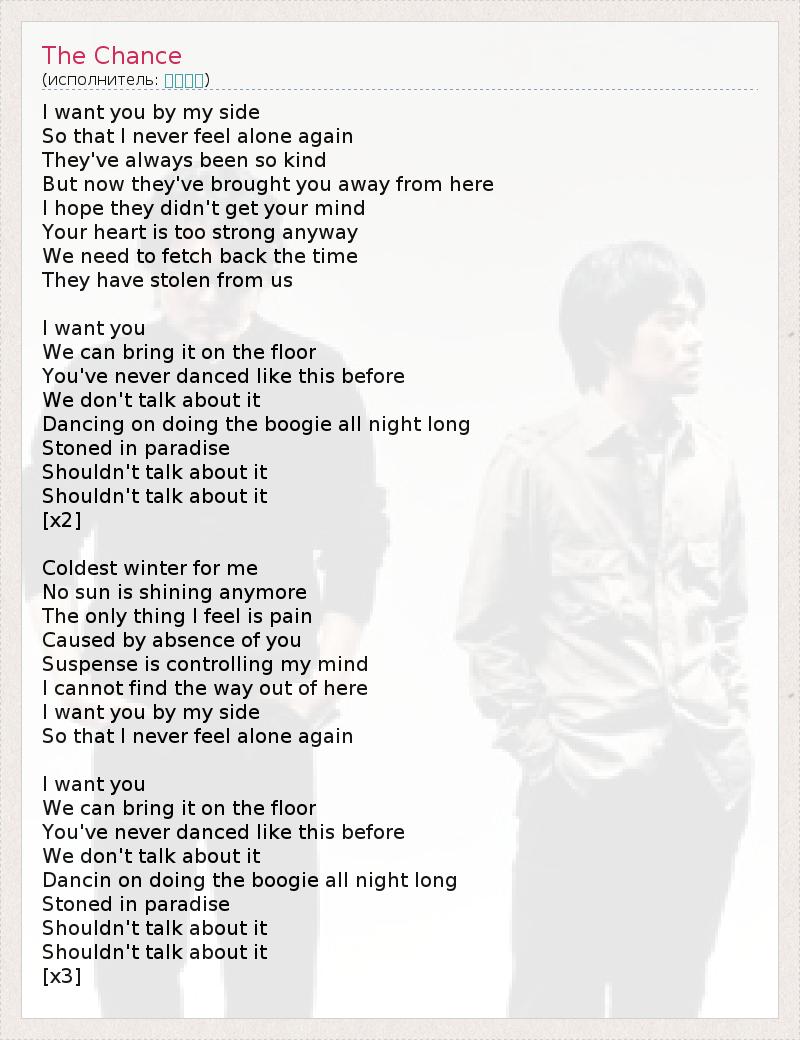Хочу, чтобы ты была со мной, Чтобы больше никогда не чувствовать одиночество. К нам всегда были так добры, Но сейчас тебя увезли отсюда. Надеюсь, твой разум не побежден, Все равно твое сердце непоколебимо. Нам нужно вернуть назад то время, Которое у нас отняли. Я хочу тебя, Мы можем выйти на танцпол, Ты никогда еще так не танцевала, Но мы об этом не разговариваем. Танцуем, зажигаем без устали всю ночь, Опьяненные этим раем, Не стоит разговаривать об этом, Не стоит разговаривать об этом. [x2] Эта зима для меня самая холодная, Солнце больше мне не светит, Все, что я чувствую - это боль, Потому что ты не со мной. Мой разум подавлен неизвестностью, Я не нахожу выход из этого состояния. Я хочу, чтобы ты была со мной, Чтобы больше никогда не чувствовать одиночество. Я хочу тебя, Мы можем выйти на танцпол, Ты никогда еще так не танцевала, Но мы об этом не разговариваем. Танцуем, зажигаем без устали всю ночь, Опьяненные этим раем, Не стоит разговаривать об этом, Не стоит разговаривать об этом. [x3]