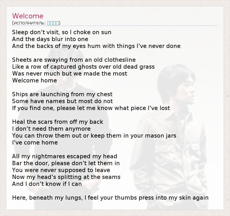 Покинул сон, поэтому я поперхнулся солнцем. И все дни смазались в один. И всё то, что я не сделал, теребит мне душу. Простыни треплются на старой бельевой верёвке, Подобно ряду пленных приведений над старой ветошью. Не много было сделано, но всё же мы сделали всё, что могли. Добро пожаловать домой! Корабли отправляются с моей груди. Некоторые имеют имена, но большинство – нет. Если встретишь какого-нибудь, пожалуйста, скажи, что я потерял... Излечи шрамы на моей спине. Они мне больше не нужны. Можешь выкинуть их, а можешь хранить их у себя. Теперь я дома... Все кошмары сбежали из моей головы. Запри дверь на засов, пожалуйста, не дай им войти. Ты не должна была уходить. Сейчас моя голова раскалывается на части. И я не знаю, могу ли я... Здесь, под лёгкими, я чувствую, как твои пальцы опять впечатываются в мою кожу...