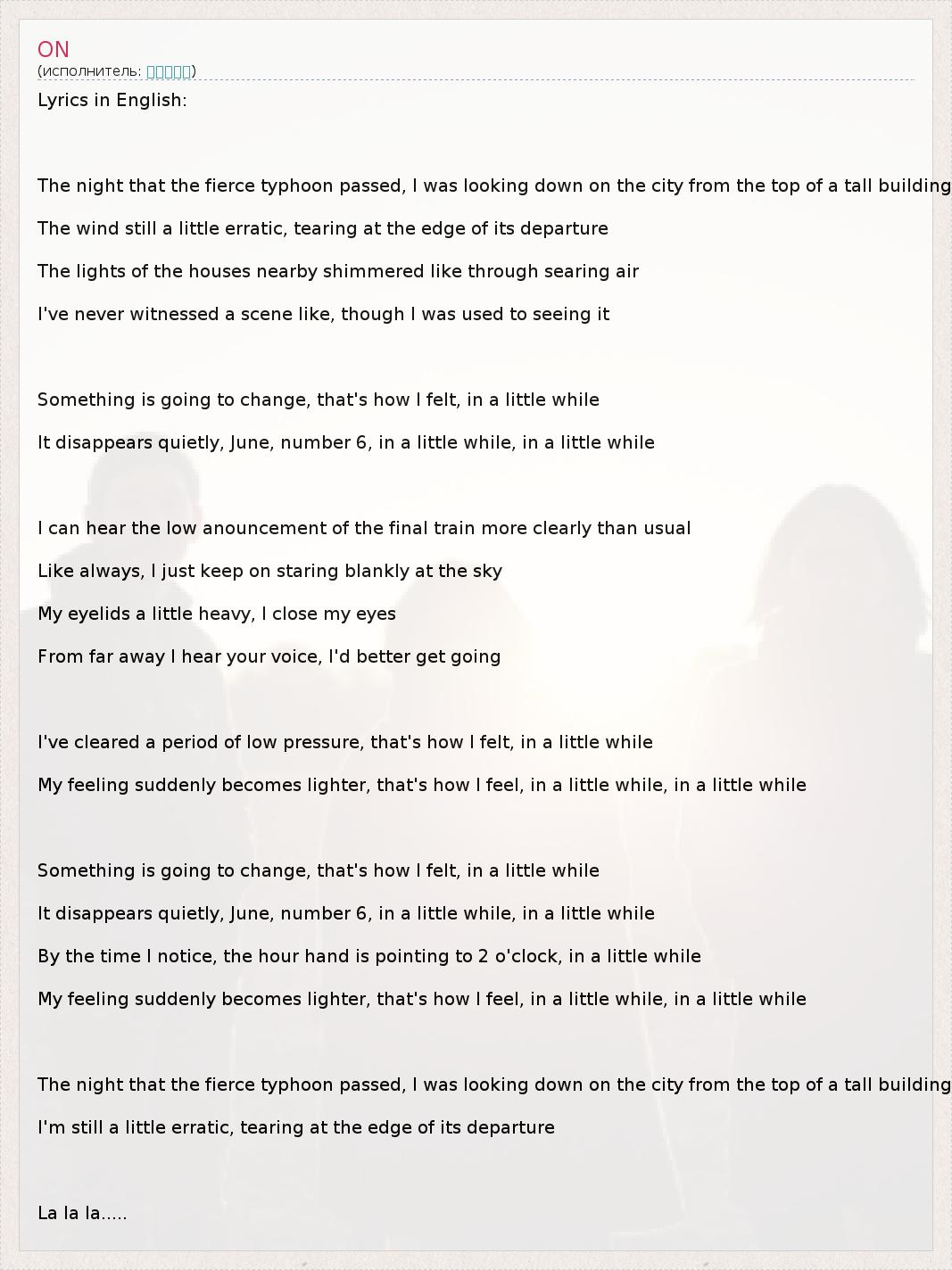 Lyrics in English: The night that the fierce typhoon passed, I was looking down on the city from the top of a tall building The wind still a little erratic, tearing at the edge of its departure The lights of the houses nearby shimmered like through searing air I've never witnessed a scene like, though I was used to seeing it Something is going to change, that's how I felt, in a little while It disappears quietly, June, number 6, in a little while, in a little while I can hear the low anouncement of the final train more clearly than usual Like always, I just keep on staring blankly at the sky My eyelids a little heavy, I close my eyes From far away I hear your voice, I'd better get going I've cleared a period of low pressure, that's how I felt, in a little while My feeling suddenly becomes lighter, that's how I feel, in a little while, in a little while Something is going to change, that's how I felt, in a little while It disappears quietly, June, number 6, in a little while, in a little while By the time I notice, the hour hand is pointing to 2 o'clock, in a little while My feeling suddenly becomes lighter, that's how I feel, in a little while, in a little while The night that the fierce typhoon passed, I was looking down on the city from the top of a tall building I'm still a little erratic, tearing at the edge of its departure La la la.....
