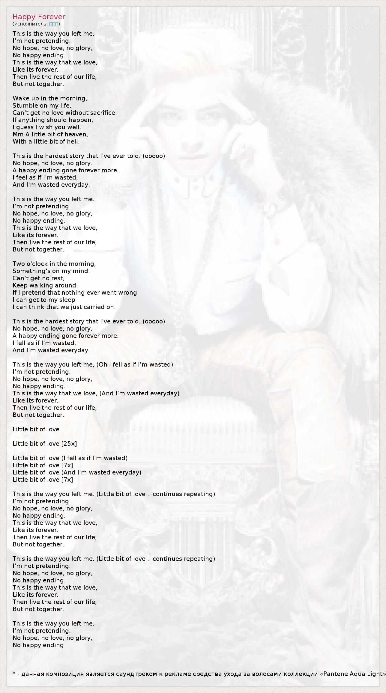 * - данная композиция является саундтреком к рекламе средства ухода за волосами коллекции «Pantene Aqua Light»
