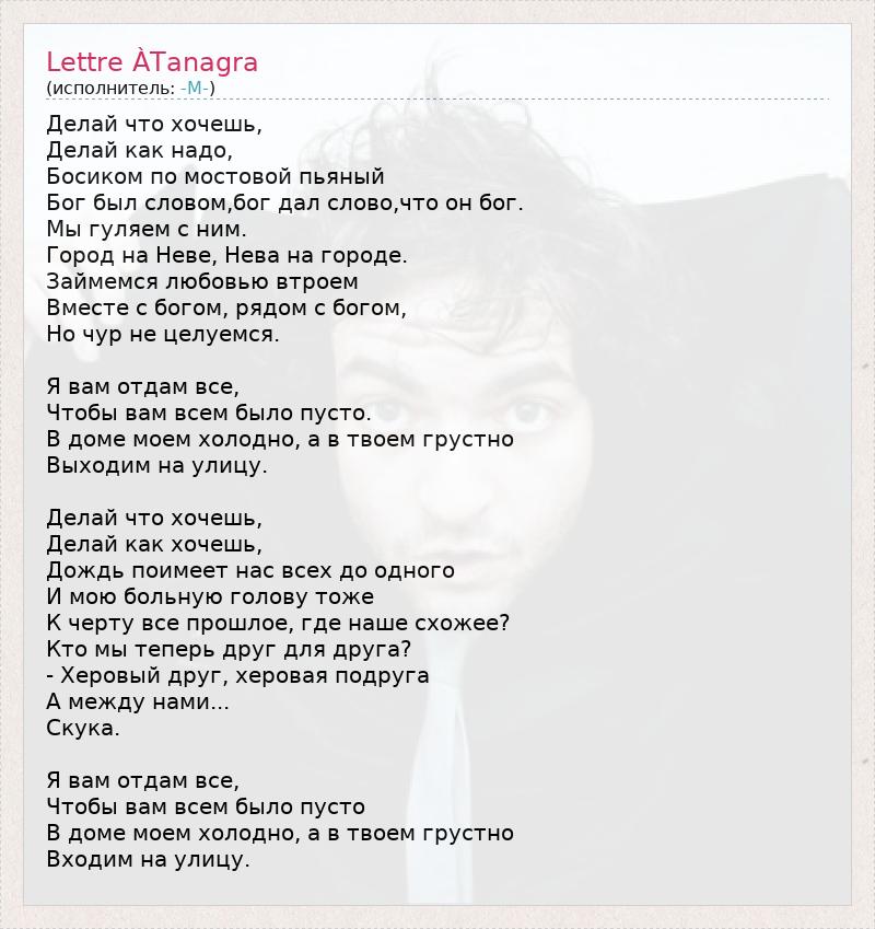 Делай что хочешь, Делай как надо, Босиком по мостовой пьяный Бог был словом,бог дал слово,что он бог. Мы гуляем с ним. Город на Неве, Нева на городе. Займемся любовью втроем Вместе с богом, рядом с богом, Но чур не целуемся. Я вам отдам все, Чтобы вам всем было пусто. В доме моем холодно, а в твоем грустно Выходим на улицу. Делай что хочешь, Делай как хочешь, Дождь поимеет нас всех до одного И мою больную голову тоже К черту все прошлое, где наше схожее? Кто мы теперь друг для друга? - Херовый друг, херовая подруга А между нами... Скука. Я вам отдам все, Чтобы вам всем было пусто В доме моем холодно, а в твоем грустно Входим на улицу.