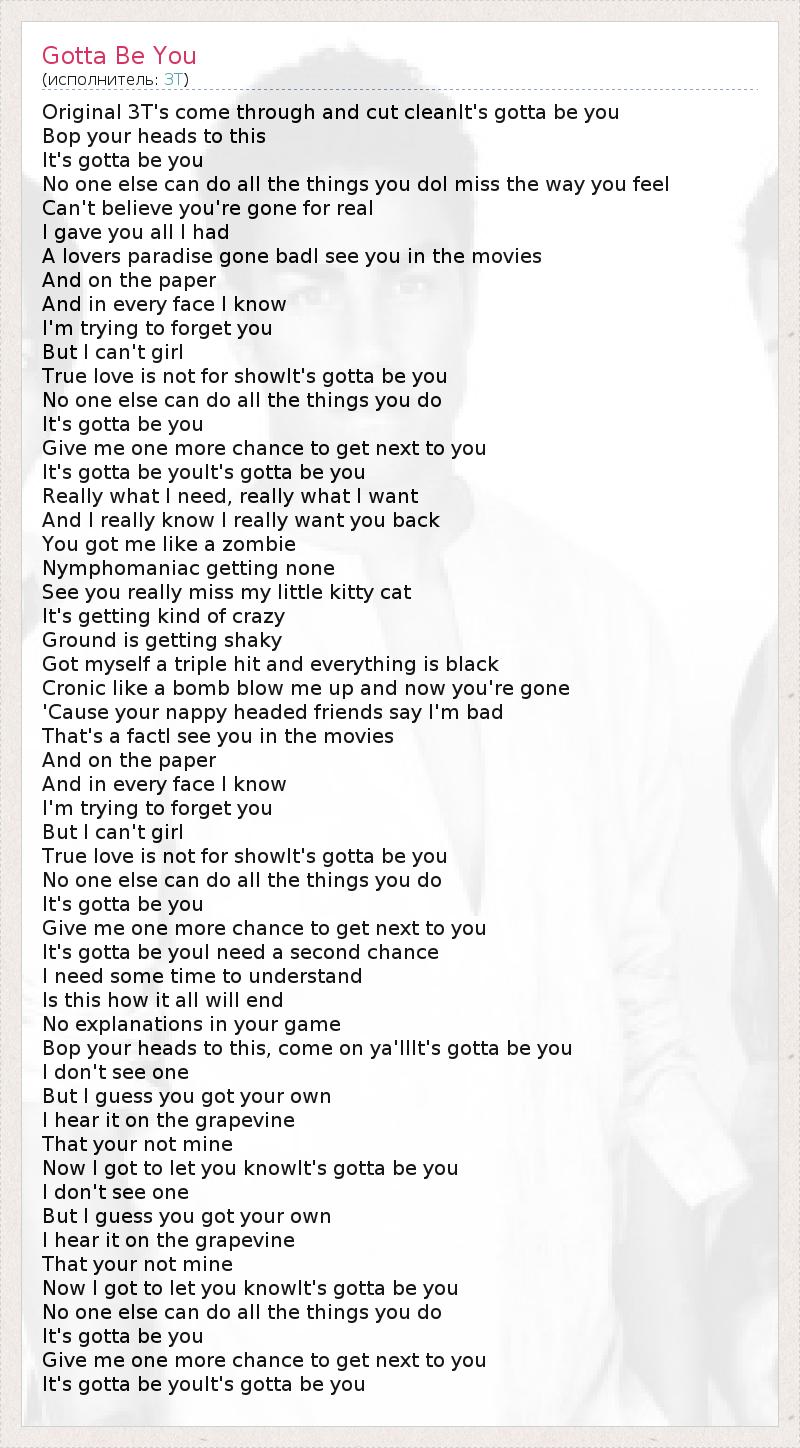 Original 3T's come through and cut cleanIt's gotta be you Bop your heads to this It's gotta be you No one else can do all the things you doI miss the way you feel Can't believe you're gone for real I gave you all I had A lovers paradise gone badI see you in the movies And on the paper And in every face I know I'm trying to forget you But I can't girl True love is not for showIt's gotta be you No one else can do all the things you do It's gotta be you Give me one more chance to get next to you It's gotta be youIt's gotta be you Really what I need, really what I want And I really know I really want you back You got me like a zombie Nymphomaniac getting none See you really miss my little kitty cat It's getting kind of crazy Ground is getting shaky Got myself a triple hit and everything is black Cronic like a bomb blow me up and now you're gone 'Cause your nappy headed friends say I'm bad That's a factI see you in the movies And on the paper And in every face I know I'm trying to forget you But I can't girl True love is not for showIt's gotta be you No one else can do all the things you do It's gotta be you Give me one more chance to get next to you It's gotta be youI need a second chance I need some time to understand Is this how it all will end No explanations in your game Bop your heads to this, come on ya'llIt's gotta be you I don't see one But I guess you got your own I hear it on the grapevine That your not mine Now I got to let you knowIt's gotta be you I don't see one But I guess you got your own I hear it on the grapevine That your not mine Now I got to let you knowIt's gotta be you No one else can do all the things you do It's gotta be you Give me one more chance to get next to you It's gotta be youIt's gotta be you