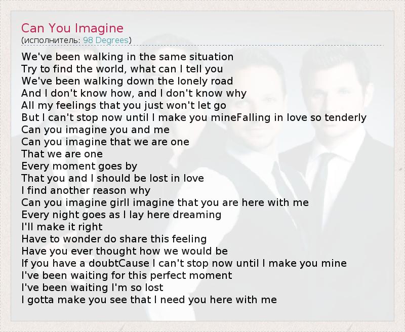 We've been walking in the same situation Try to find the world, what can I tell you We've been walking down the lonely road And I don't know how, and I don't know why All my feelings that you just won't let go But I can't stop now until I make you mineFalling in love so tenderly Can you imagine you and me Can you imagine that we are one That we are one Every moment goes by That you and I should be lost in love I find another reason why Can you imagine girlI imagine that you are here with me Every night goes as I lay here dreaming I'll make it right Have to wonder do share this feeling Have you ever thought how we would be If you have a doubtCause I can't stop now until I make you mine I've been waiting for this perfect moment I've been waiting I'm so lost I gotta make you see that I need you here with me