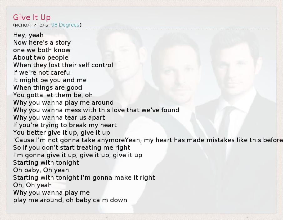 Это интересно:Мелодичный соул-квартет 98 Degrees образовался в Лос-Анджелесе в середине 90-х годов. В состав группы вошли братья Ник и Дрю Лейчи, Джефф Тиммонс и Джастин Джеффри. Все началось после того, как Джефф уехал из Огайо в Лос-Анджелес, чтобы начать музыкальную карьеру. Он сформировал группу, и когда один из ее тогдашних участников, являвшийся одноклассником Ника по школе творческих искусств в Цинциннати,... продолжение