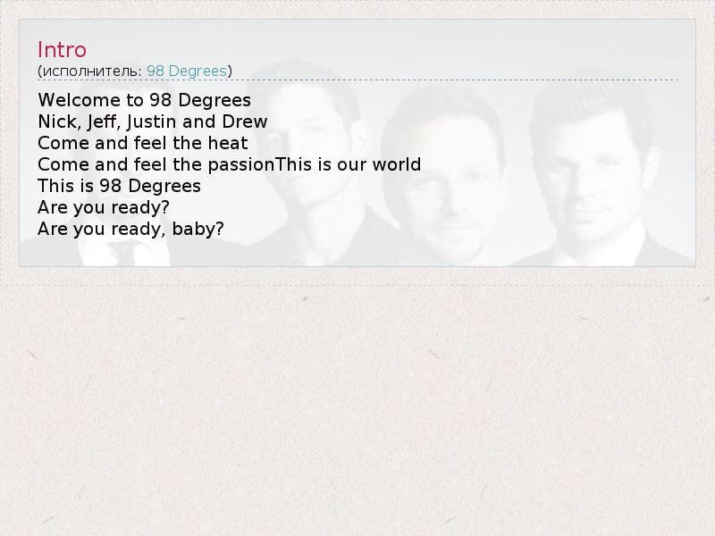Это интересно:Мелодичный соул-квартет 98 Degrees образовался в Лос-Анджелесе в середине 90-х годов. В состав группы вошли братья Ник и Дрю Лейчи, Джефф Тиммонс и Джастин Джеффри. Все началось после того, как Джефф уехал из Огайо в Лос-Анджелес, чтобы начать музыкальную карьеру. Он сформировал группу, и когда один из ее тогдашних участников, являвшийся одноклассником Ника по школе творческих искусств в Цинциннати,... продолжение
