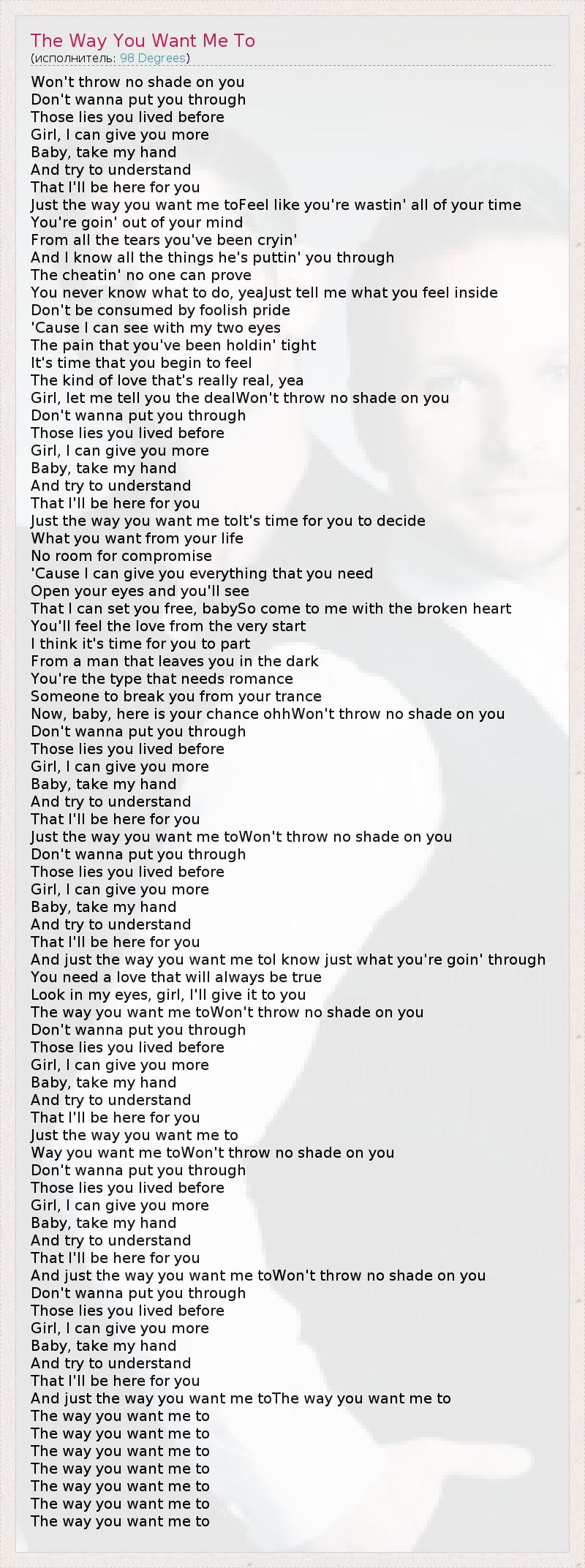 Won't throw no shade on you Don't wanna put you through Those lies you lived before Girl, I can give you more Baby, take my hand And try to understand That I'll be here for you Just the way you want me toFeel like you're wastin' all of your time You're goin' out of your mind From all the tears you've been cryin' And I know all the things he's puttin' you through The cheatin' no one can prove You never know what to do, yeaJust tell me what you feel inside Don't be consumed by foolish pride 'Cause I can see with my two eyes The pain that you've been holdin' tight It's time that you begin to feel The kind of love that's really real, yea Girl, let me tell you the dealWon't throw no shade on you Don't wanna put you through Those lies you lived before Girl, I can give you more Baby, take my hand And try to understand That I'll be here for you Just the way you want me toIt's time for you to decide What you want from your life No room for compromise 'Cause I can give you everything that you need Open your eyes and you'll see That I can set you free, babySo come to me with the broken heart You'll feel the love from the very start I think it's time for you to part From a man that leaves you in the dark You're the type that needs romance Someone to break you from your trance Now, baby, here is your chance ohhWon't throw no shade on you Don't wanna put you through Those lies you lived before Girl, I can give you more Baby, take my hand And try to understand That I'll be here for you Just the way you want me toWon't throw no shade on you Don't wanna put you through Those lies you lived before Girl, I can give you more Baby, take my hand And try to understand That I'll be here for you And just the way you want me toI know just what you're goin' through You need a love that will always be true Look in my eyes, girl, I'll give it to you The way you want me toWon't throw no shade on you Don't wanna put you through Those lies you lived before Girl, I can give you more Baby, take my hand And try to understand That I'll be here for you Just the way you want me to Way you want me toWon't throw no shade on you Don't wanna put you through Those lies you lived before Girl, I can give you more Baby, take my hand And try to understand That I'll be here for you And just the way you want me toWon't throw no shade on you Don't wanna put you through Those lies you lived before Girl, I can give you more Baby, take my hand And try to understand That I'll be here for you And just the way you want me toThe way you want me to The way you want me to The way you want me to The way you want me to The way you want me to The way you want me to The way you want me to The way you want me to
