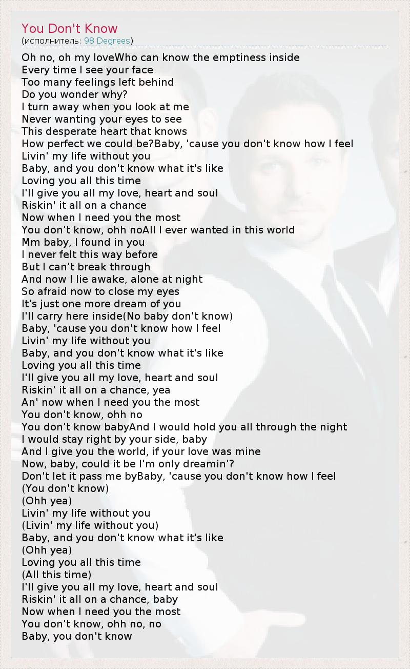 Oh no, oh my loveWho can know the emptiness inside Every time I see your face Too many feelings left behind Do you wonder why? I turn away when you look at me Never wanting your eyes to see This desperate heart that knows How perfect we could be?Baby, 'cause you don't know how I feel Livin' my life without you Baby, and you don't know what it's like Loving you all this time I'll give you all my love, heart and soul Riskin' it all on a chance Now when I need you the most You don't know, ohh noAll I ever wanted in this world Mm baby, I found in you I never felt this way before But I can't break through And now I lie awake, alone at night So afraid now to close my eyes It's just one more dream of you I'll carry here inside(No baby don't know) Baby, 'cause you don't know how I feel Livin' my life without you Baby, and you don't know what it's like Loving you all this time I'll give you all my love, heart and soul Riskin' it all on a chance, yea An' now when I need you the most You don't know, ohh no You don't know babyAnd I would hold you all through the night I would stay right by your side, baby And I give you the world, if your love was mine Now, baby, could it be I'm only dreamin'? Don't let it pass me byBaby, 'cause you don't know how I feel (You don't know) (Ohh yea) Livin' my life without you (Livin' my life without you) Baby, and you don't know what it's like (Ohh yea) Loving you all this time (All this time) I'll give you all my love, heart and soul Riskin' it all on a chance, baby Now when I need you the most You don't know, ohh no, no Baby, you don't know
