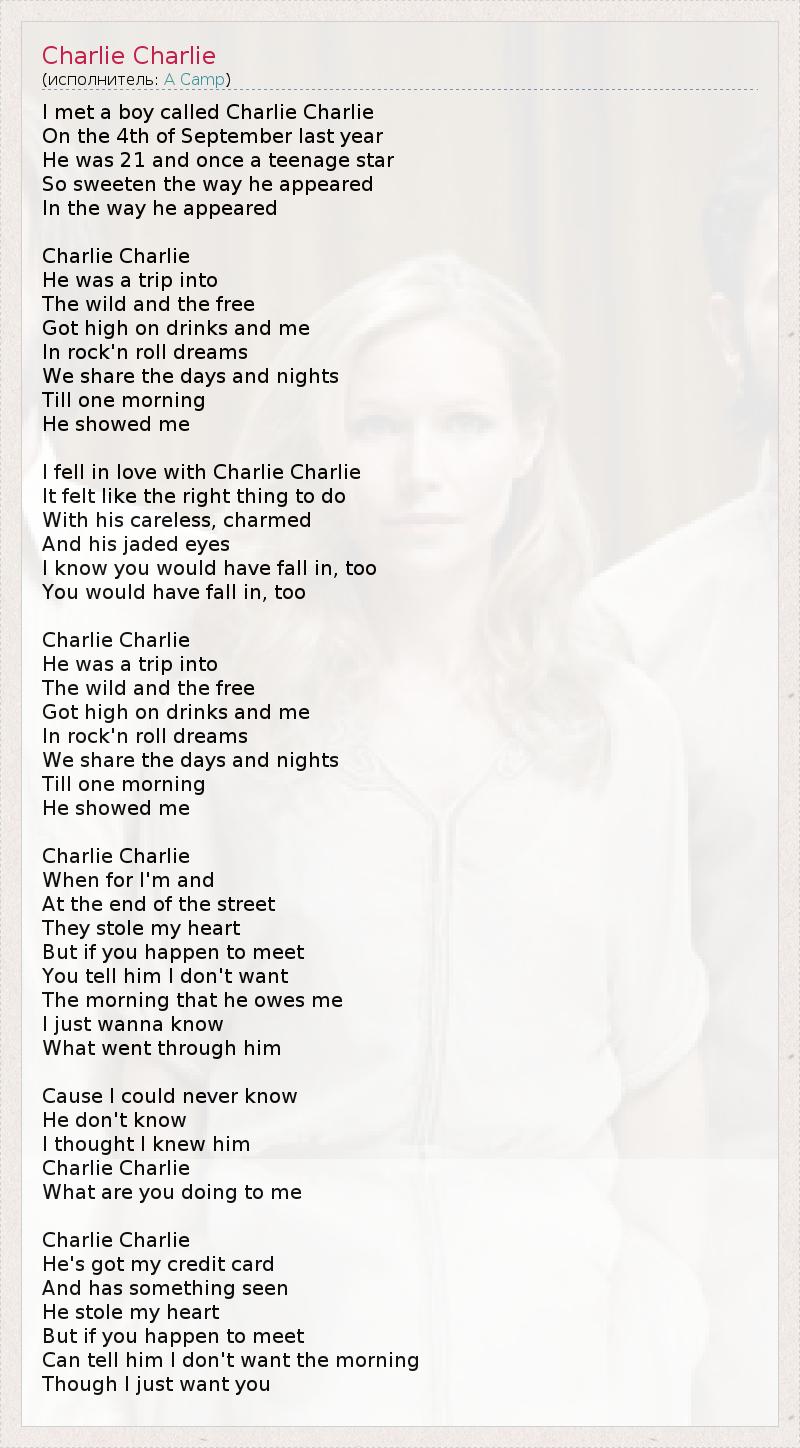 I met a boy called Charlie Charlie On the 4th of September last year He was 21 and once a teenage star So sweeten the way he appeared In the way he appeared Charlie Charlie He was a trip into The wild and the free Got high on drinks and me In rock'n roll dreams We share the days and nights Till one morning He showed me I fell in love with Charlie Charlie It felt like the right thing to do With his careless, charmed And his jaded eyes I know you would have fall in, too You would have fall in, too Charlie Charlie He was a trip into The wild and the free Got high on drinks and me In rock'n roll dreams We share the days and nights Till one morning He showed me Charlie Charlie When for I'm and At the end of the street They stole my heart But if you happen to meet You tell him I don't want The morning that he owes me I just wanna know What went through him Cause I could never know He don't know I thought I knew him Charlie Charlie What are you doing to me Charlie Charlie He's got my credit card And has something seen He stole my heart But if you happen to meet Can tell him I don't want the morning Though I just want you