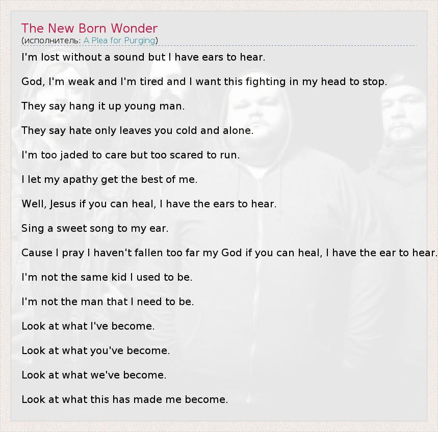 I'm lost without a sound but I have ears to hear. God, I'm weak and I'm tired and I want this fighting in my head to stop. They say hang it up young man. They say hate only leaves you cold and alone. I'm too jaded to care but too scared to run. I let my apathy get the best of me. Well, Jesus if you can heal, I have the ears to hear. Sing a sweet song to my ear. Cause I pray I haven't fallen too far my God if you can heal, I have the ear to hear. I'm not the same kid I used to be. I'm not the man that I need to be. Look at what I've become. Look at what you've become. Look at what we've become. Look at what this has made me become.