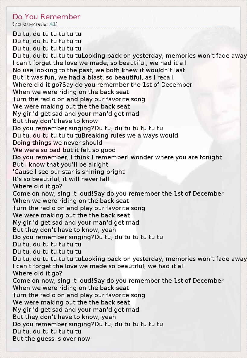 Du tu, du tu tu tu tu tu Du tu, du tu tu tu tu tu Du tu, du tu tu tu tu tu Du tu, du tu tu tu tu tuLooking back on yesterday, memories won't fade away I can't forget the love we made, so beautiful, we had it all No use looking to the past, we both knew it wouldn't last But it was fun, we had a blast, so beautiful, as I recall Where did it go?Say do you remember the 1st of December When we were riding on the back seat Turn the radio on and play our favorite song We were making out the the back seat My girl'd get sad and your man'd get mad But they don't have to know Do you remember singing?Du tu, du tu tu tu tu tu Du tu, du tu tu tu tu tuBreaking rules we always would Doing things we never should We were so bad but it felt so good Do you remember, I think I rememberI wonder where you are tonight But I know that you'll be alright 'Cause I see our star is shining bright It's so beautiful, it will never fall Where did it go? Come on now, sing it loud!Say do you remember the 1st of December When we were riding on the back seat Turn the radio on and play our favorite song We were making out the the back seat My girl'd get sad and your man'd get mad But they don't have to know, yeah Do you remember singing?Du tu, du tu tu tu tu tu Du tu, du tu tu tu tu tu Du tu, du tu tu tu tu tu Du tu, du tu tu tu tu tuLooking back on yesterday, memories won't fade away I can't forget the love we made so beautiful, we had it all Where did it go? Come on now, sing it loud!Say do you remember the 1st of December When we were riding on the back seat Turn the radio on and play our favorite song We were making out the the back seat My girl'd get sad and your man'd get mad But they don't have to know, yeah Do you remember singing?Du tu, du tu tu tu tu tu Du tu, du tu tu tu tu tu But the guess is over now