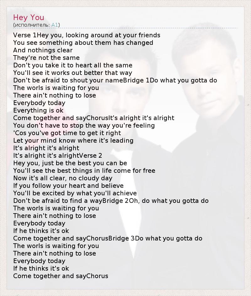 Verse 1Hey you, looking around at your friends You see something about them has changed And nothings clear They're not the same Don't you take it to heart all the same You'll see it works out better that way Don't be afraid to shout your nameBridge 1Do what you gotta do The worls is waiting for you There ain't nothing to lose Everybody today Everything is ok Come together and sayChorusIt's alright it's alright You don't have to stop the way you're feeling 'Cos you've got time to get it right Let your mind know where it's leading It's alright it's alright It's alright it's alrightVerse 2 Hey you, just be the best you can be You'll see the best things in life come for free Now it's all clear, no cloudy day If you follow your heart and believe You'll be excited by what you'll achieve Don't be afraid to find a wayBridge 2Oh, do what you gotta do The worls is waiting for you There ain't nothing to lose Everybody today If he thinks it's ok Come together and sayChorusBridge 3Do what you gotta do The worls is waiting for you There ain't nothing to lose Everybody today If he thinks it's ok Come together and sayChorus