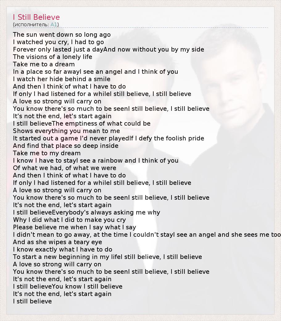 The sun went down so long ago I watched you cry, I had to go Forever only lasted just a dayAnd now without you by my side The visions of a lonely life Take me to a dream In a place so far awayI see an angel and I think of you I watch her hide behind a smile And then I think of what I have to do If only I had listened for a whileI still believe, I still believe A love so strong will carry on You know there's so much to be seenI still believe, I still believe It's not the end, let's start again I still believeThe emptiness of what could be Shows everything you mean to me It started out a game I'd never playedIf I defy the foolish pride And find that place so deep inside Take me to my dream I know I have to stayI see a rainbow and I think of you Of what we had, of what we were And then I think of what I have to do If only I had listened for a whileI still believe, I still believe A love so strong will carry on You know there's so much to be seenI still believe, I still believe It's not the end, let's start again I still believeEverybody's always asking me why Why I did what I did to make you cry Please believe me when I say what I say I didn't mean to go away, at the time I couldn't stayI see an angel and she sees me too And as she wipes a teary eye I know exactly what I have to do To start a new beginning in my lifeI still believe, I still believe A love so strong will carry on You know there's so much to be seenI still believe, I still believe It's not the end, let's start again I still believeYou know I still believe It's not the end, let's start again I still believe