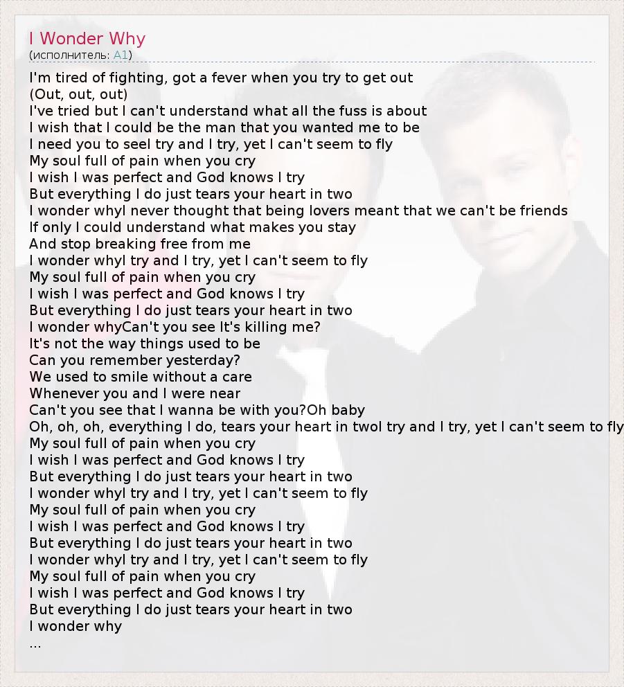I'm tired of fighting, got a fever when you try to get out (Out, out, out) I've tried but I can't understand what all the fuss is about I wish that I could be the man that you wanted me to be I need you to seeI try and I try, yet I can't seem to fly My soul full of pain when you cry I wish I was perfect and God knows I try But everything I do just tears your heart in two I wonder whyI never thought that being lovers meant that we can't be friends If only I could understand what makes you stay And stop breaking free from me I wonder whyI try and I try, yet I can't seem to fly My soul full of pain when you cry I wish I was perfect and God knows I try But everything I do just tears your heart in two I wonder whyCan't you see It's killing me? It's not the way things used to be Can you remember yesterday? We used to smile without a care Whenever you and I were near Can't you see that I wanna be with you?Oh baby Oh, oh, oh, everything I do, tears your heart in twoI try and I try, yet I can't seem to fly My soul full of pain when you cry I wish I was perfect and God knows I try But everything I do just tears your heart in two I wonder whyI try and I try, yet I can't seem to fly My soul full of pain when you cry I wish I was perfect and God knows I try But everything I do just tears your heart in two I wonder whyI try and I try, yet I can't seem to fly My soul full of pain when you cry I wish I was perfect and God knows I try But everything I do just tears your heart in two I wonder why ...