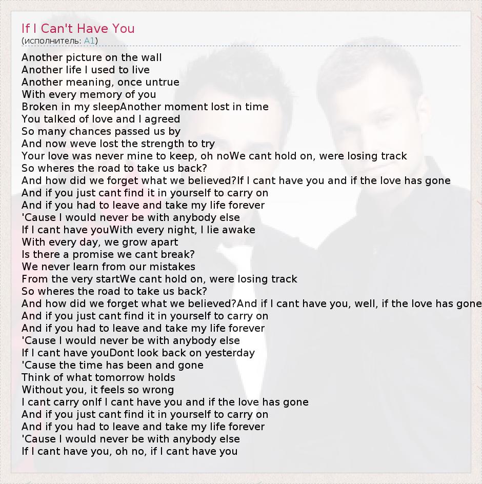 Another picture on the wall Another life I used to live Another meaning, once untrue With every memory of you Broken in my sleepAnother moment lost in time You talked of love and I agreed So many chances passed us by And now weve lost the strength to try Your love was never mine to keep, oh noWe cant hold on, were losing track So wheres the road to take us back? And how did we forget what we believed?If I cant have you and if the love has gone And if you just cant find it in yourself to carry on And if you had to leave and take my life forever 'Cause I would never be with anybody else If I cant have youWith every night, I lie awake With every day, we grow apart Is there a promise we cant break? We never learn from our mistakes From the very startWe cant hold on, were losing track So wheres the road to take us back? And how did we forget what we believed?And if I cant have you, well, if the love has gone And if you just cant find it in yourself to carry on And if you had to leave and take my life forever 'Cause I would never be with anybody else If I cant have youDont look back on yesterday 'Cause the time has been and gone Think of what tomorrow holds Without you, it feels so wrong I cant carry onIf I cant have you and if the love has gone And if you just cant find it in yourself to carry on And if you had to leave and take my life forever 'Cause I would never be with anybody else If I cant have you, oh no, if I cant have you