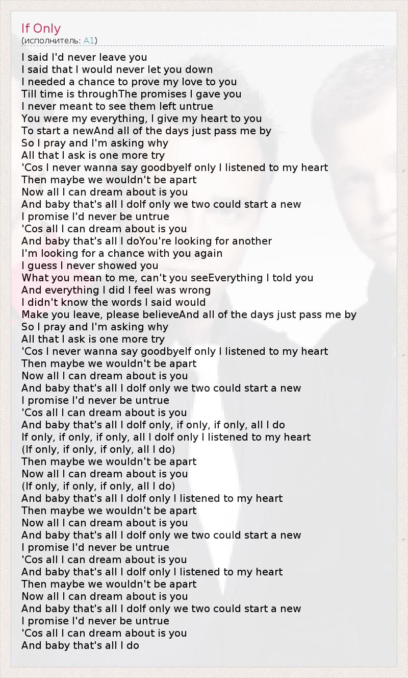 I said I'd never leave you I said that I would never let you down I needed a chance to prove my love to you Till time is throughThe promises I gave you I never meant to see them left untrue You were my everything, I give my heart to you To start a newAnd all of the days just pass me by So I pray and I'm asking why All that I ask is one more try 'Cos I never wanna say goodbyeIf only I listened to my heart Then maybe we wouldn't be apart Now all I can dream about is you And baby that's all I doIf only we two could start a new I promise I'd never be untrue 'Cos all I can dream about is you And baby that's all I doYou're looking for another I'm looking for a chance with you again I guess I never showed you What you mean to me, can't you seeEverything I told you And everything I did I feel was wrong I didn't know the words I said would Make you leave, please believeAnd all of the days just pass me by So I pray and I'm asking why All that I ask is one more try 'Cos I never wanna say goodbyeIf only I listened to my heart Then maybe we wouldn't be apart Now all I can dream about is you And baby that's all I doIf only we two could start a new I promise I'd never be untrue 'Cos all I can dream about is you And baby that's all I doIf only, if only, if only, all I do If only, if only, if only, all I doIf only I listened to my heart (If only, if only, if only, all I do) Then maybe we wouldn't be apart Now all I can dream about is you (If only, if only, if only, all I do) And baby that's all I doIf only I listened to my heart Then maybe we wouldn't be apart Now all I can dream about is you And baby that's all I doIf only we two could start a new I promise I'd never be untrue 'Cos all I can dream about is you And baby that's all I doIf only I listened to my heart Then maybe we wouldn't be apart Now all I can dream about is you And baby that's all I doIf only we two could start a new I promise I'd never be untrue 'Cos all I can dream about is you And baby that's all I do