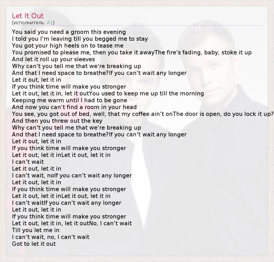 You said you need a groom this evening I told you I'm leaving till you begged me to stay You got your high heels on to tease me You promised to please me, then you take it awayThe fire's fading, baby, stoke it up And let it roll up your sleeves Why can't you tell me that we're breaking up And that I need space to breathe?If you can't wait any longer Let it out, let it in If you think time will make you stronger Let it out, let it in, let it outYou used to keep me up till the morning Keeping me warm until I had to be gone And now you can't find a room in your head You see, you got out of bed, well, that my coffee ain't onThe door is open, do you lock it up? And then you threw out the key Why can't you tell me that we're breaking up And that I need space to breathe?If you can't wait any longer Let it out, let it in If you think time will make you stronger Let it out, let it inLet it out, let it in I can't wait Let it out, let it in I can't wait, noIf you can't wait any longer Let it out, let it in If you think time will make you stronger Let it out, let it inLet it out, let it in I can't waitIf you can't wait any longer Let it out, let it in If you think time will make you stronger Let it out, let it in, let it outNo, I can't wait Till you let me in I can't wait, no, I can't wait Got to let it out