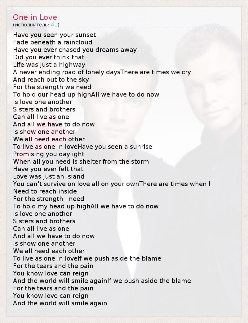 Have you seen your sunset Fade beneath a raincloud Have you ever chased you dreams away Did you ever think that Life was just a highway A never ending road of lonely daysThere are times we cry And reach out to the sky For the strength we need To hold our head up highAll we have to do now Is love one another Sisters and brothers Can all live as one And all we have to do now Is show one another We all need each other To live as one in loveHave you seen a sunrise Promising you daylight When all you need is shelter from the storm Have you ever felt that Love was just an island You can't survive on love all on your ownThere are times when I Need to reach inside For the strength I need To hold my head up highAll we have to do now Is love one another Sisters and brothers Can all live as one And all we have to do now Is show one another We all need each other To live as one in loveIf we push aside the blame For the tears and the pain You know love can reign And the world will smile againIf we push aside the blame For the tears and the pain You know love can reign And the world will smile again