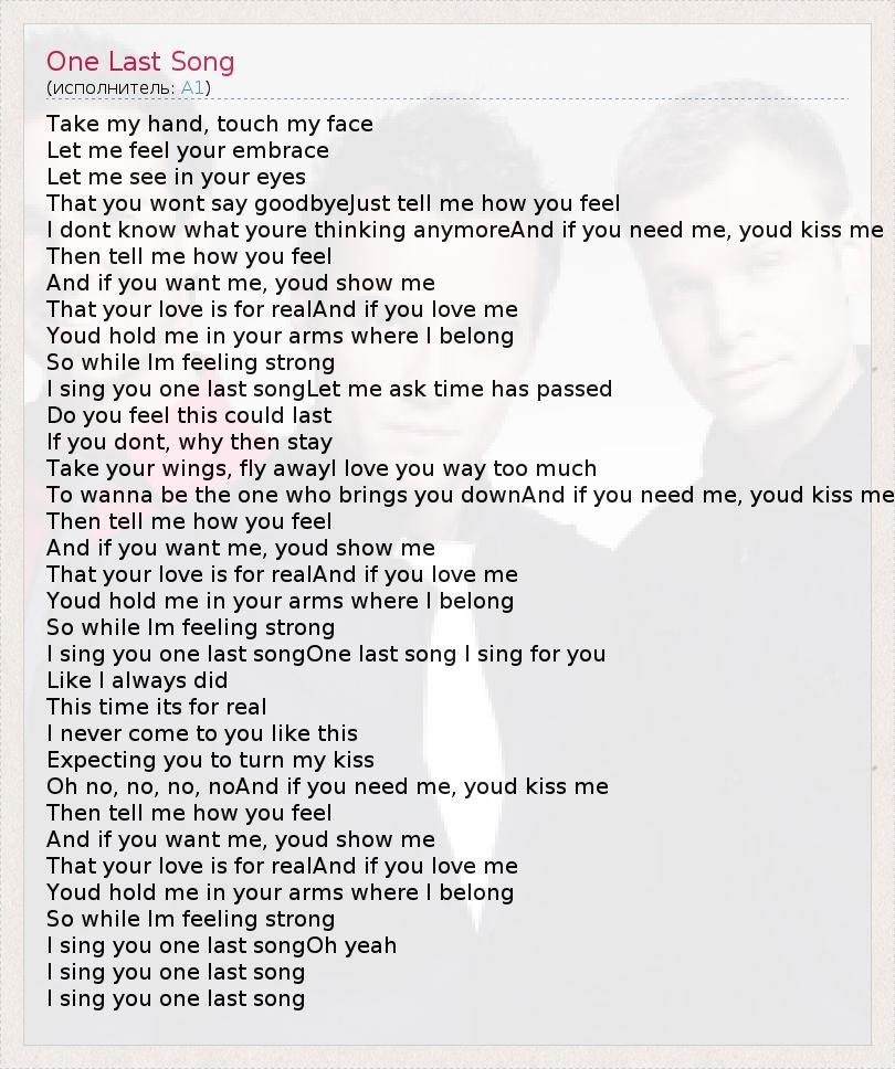 Take my hand, touch my face Let me feel your embrace Let me see in your eyes That you wont say goodbyeJust tell me how you feel I dont know what youre thinking anymoreAnd if you need me, youd kiss me Then tell me how you feel And if you want me, youd show me That your love is for realAnd if you love me Youd hold me in your arms where I belong So while Im feeling strong I sing you one last songLet me ask time has passed Do you feel this could last If you dont, why then stay Take your wings, fly awayI love you way too much To wanna be the one who brings you downAnd if you need me, youd kiss me Then tell me how you feel And if you want me, youd show me That your love is for realAnd if you love me Youd hold me in your arms where I belong So while Im feeling strong I sing you one last songOne last song I sing for you Like I always did This time its for real I never come to you like this Expecting you to turn my kiss Oh no, no, no, noAnd if you need me, youd kiss me Then tell me how you feel And if you want me, youd show me That your love is for realAnd if you love me Youd hold me in your arms where I belong So while Im feeling strong I sing you one last songOh yeah I sing you one last song I sing you one last song